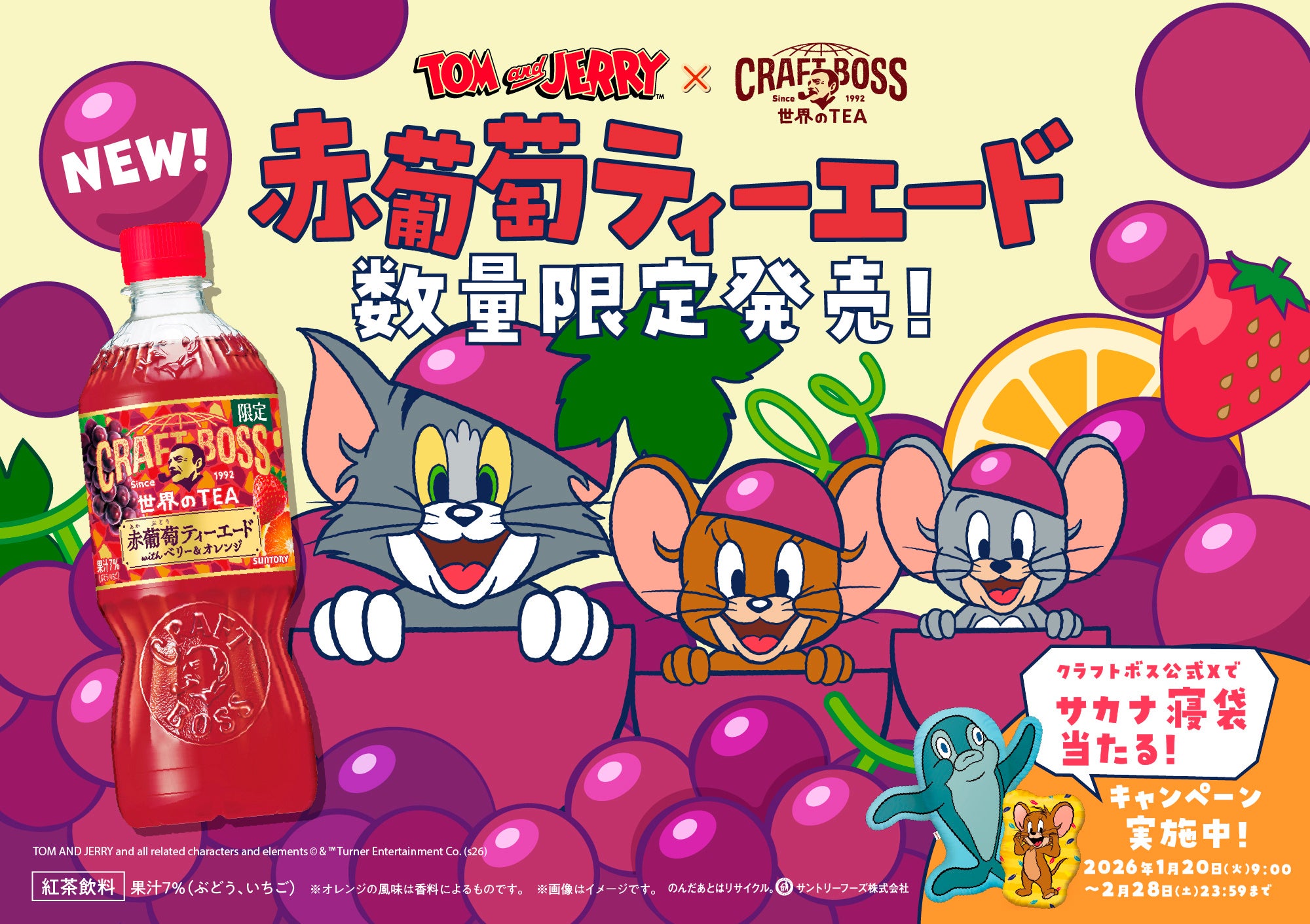 サントリー食品インターナショナル(株)は、「クラフトボス 世界のTEA」シリーズから、「赤葡萄ティーエード」を1月20日(火)より期間限定発売します。また、本商品の発売を記念して、Xで実施中の「トムとジェリー×世界のTEA」コラボグッズが当たるキャンペーンの第2弾を実施します。
