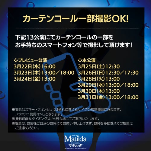 下記13公演にて、カーテンコールの一部をお手持ちのスマートフォン等で撮影して頂けます!