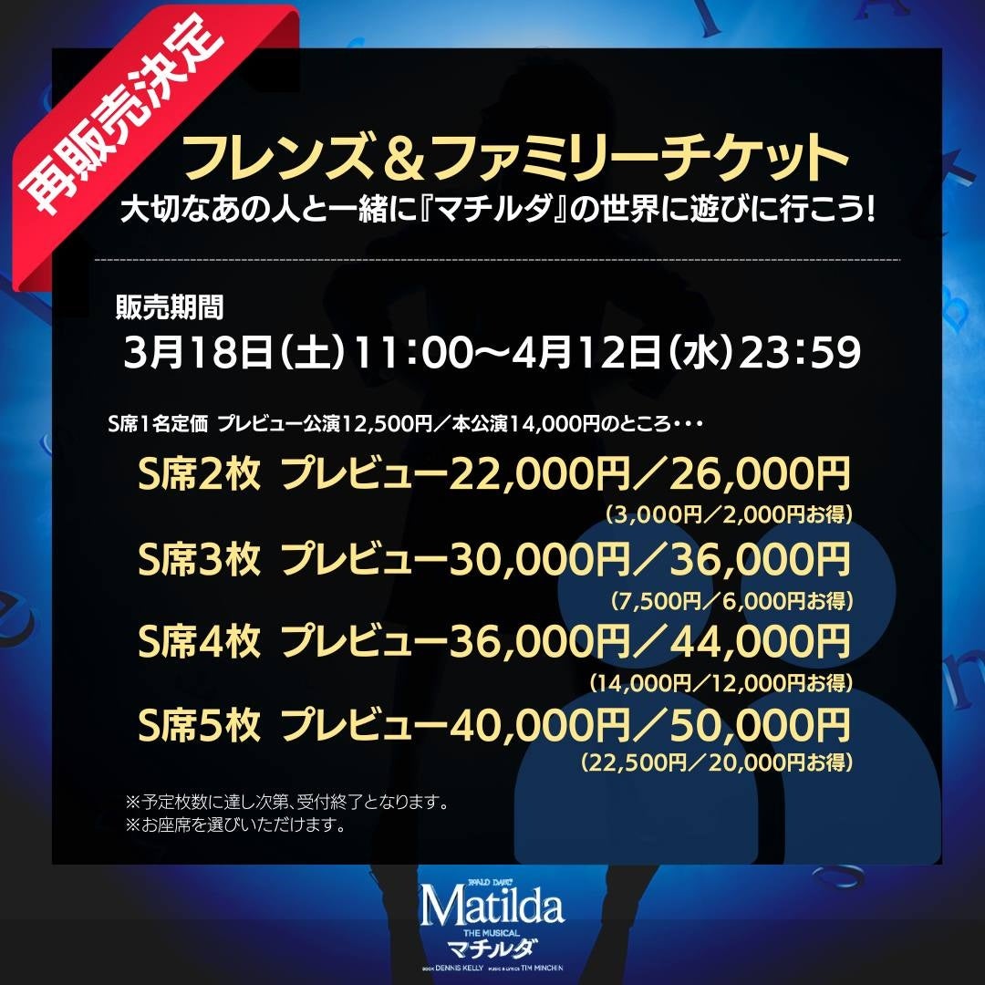 お友達やご家族と一緒だと、お得に購入できるフレンズ&ファミリーチケットを再販売致します。お座席をお選びいただけるので、お隣同士での観劇が可能です。