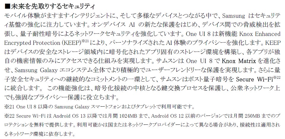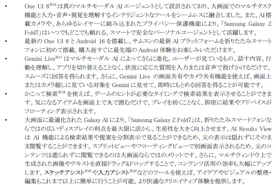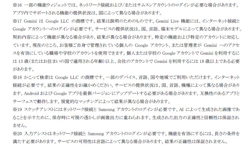 ※15 特定の AI 機能を使用するには、Samsungアカウントのログインが必要な場合があります。サムスンはAI機能によって提供される出力の正確性、完全性、信頼性について、いかなる約束、保証も行いません。Galaxy AI機能の利用可否は地域/国、OS/One UIのバージョン、モデル、販売先によって異なる場合があります。