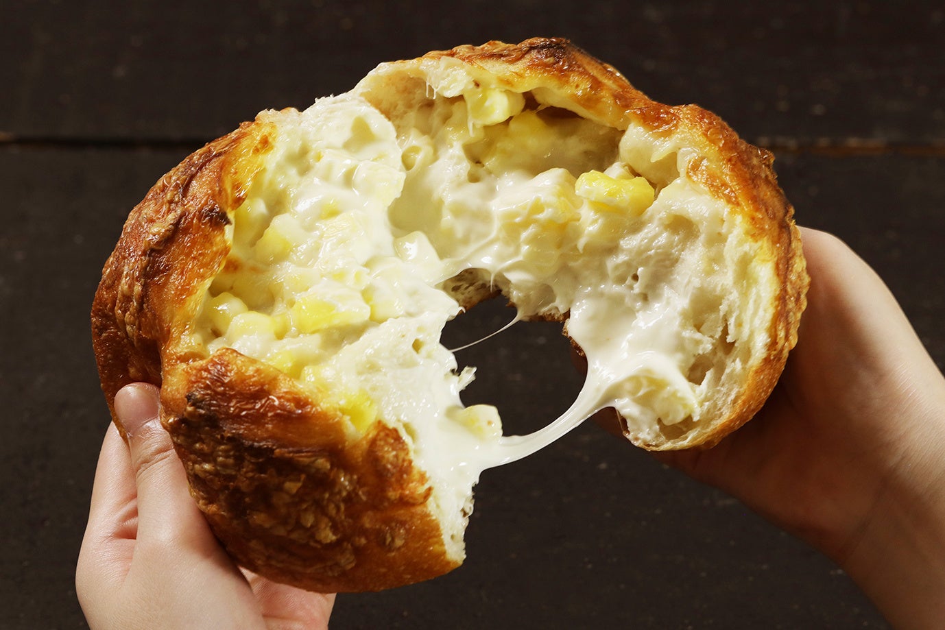 濃厚でクリーミーなチーズが入っていて、外はカリッ、中はモチッとしたアンティーク人気の惣菜パンです。5種のチーズ(ゴーダ、モッツァレラ、エメンタール、カマンベール、クリームチーズ)が絡み合い、コクのあるチーズ感と、食べた瞬間に広がるチーズの味わいをお楽しみいただけます。焼き立てでも冷めてものびるチーズフランスは、味わいはもちろん、見た目でもお楽しみいただけます。さらにリベイクいただくと「中はもっちり」「外はカリッ」として、チーズフランスのおいしさをよりご堪能いただけます。