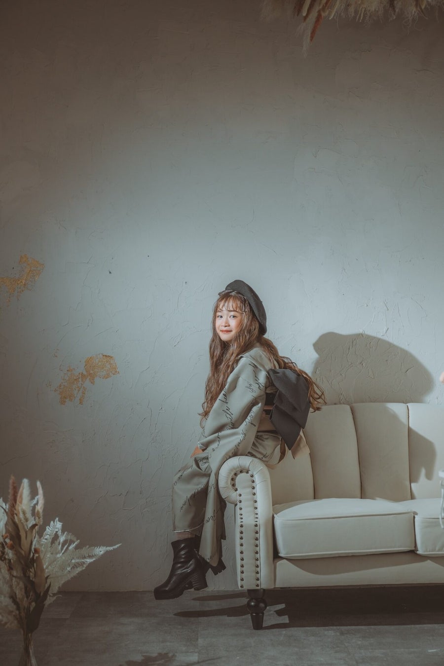 Palette+plusオリジナル着物"カプチーノ"にベレー帽を合わせたモダンかつシックなスタイリングに。ソファに座ったり、寝転んだり、寄りかかったり。様々なポーズでご撮影いただけます。