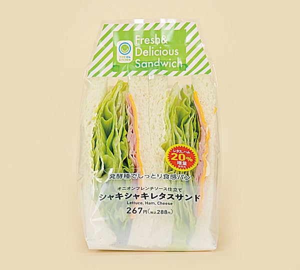 【内容】シャキシャキとした食感のレタスに、ポークハム、チェダーチーズを合わせ、オニオンフレンチソースで味付けしたサンドイッチです。レタスとポークハムを20%増量しました。※20%増量は当社比です。