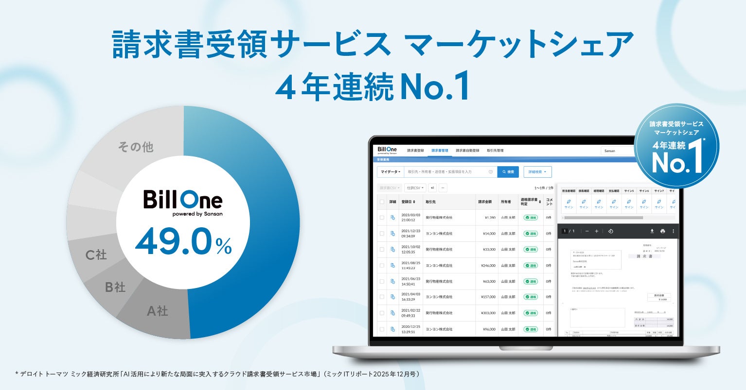 働き方を変えるAXサービスを提供するSansan株式会社は、デロイト トーマツ ミック経済研究所株式会社が実施した請求書受領サービスの市場動向調査(※1)において経理DXサービス「Bill One」が、マーケットシェアNo.1を獲得したことを発表します。Bill Oneは本調査において、4年連続でマーケットシェアNo.1を獲得しました。