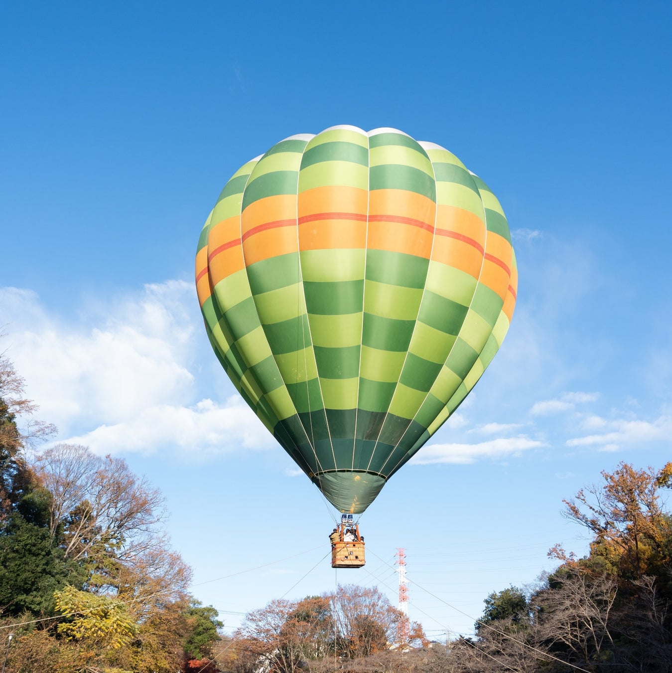 係留⾶⾏による気球の搭乗体験です。10メートルの⾼さを上下します。気球に乗って⾒る公園は、いつもと違って⾒えるかも?