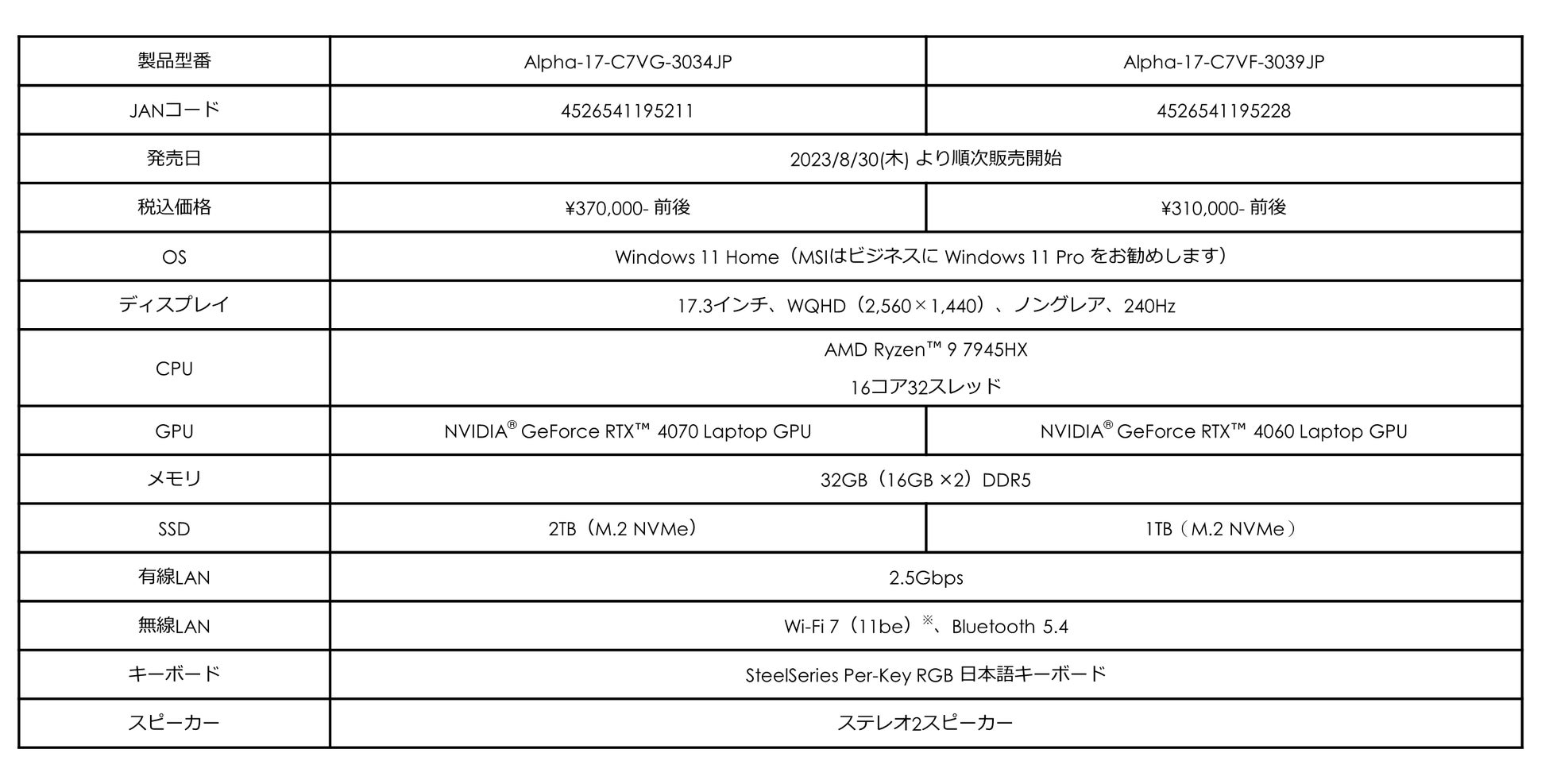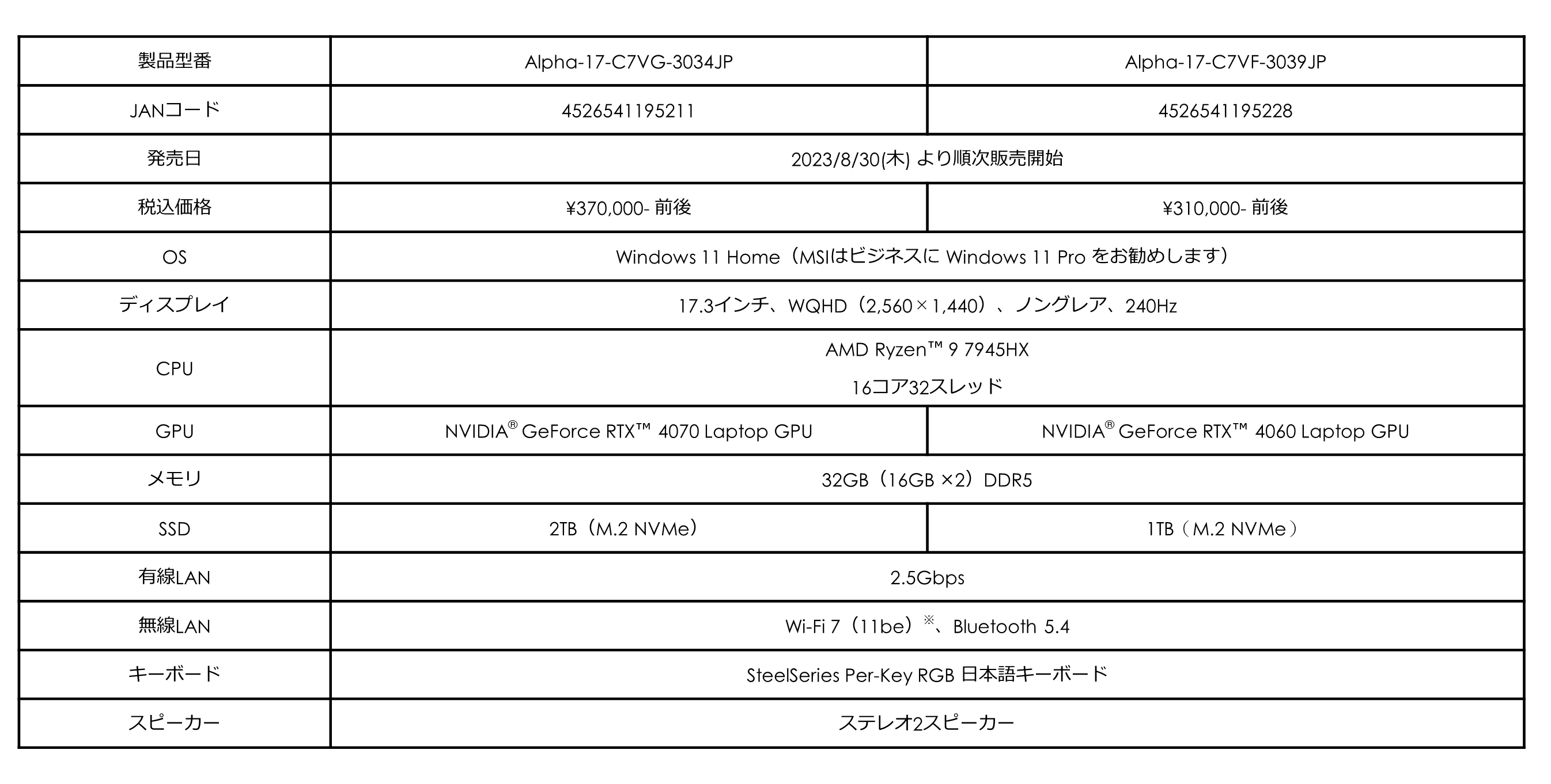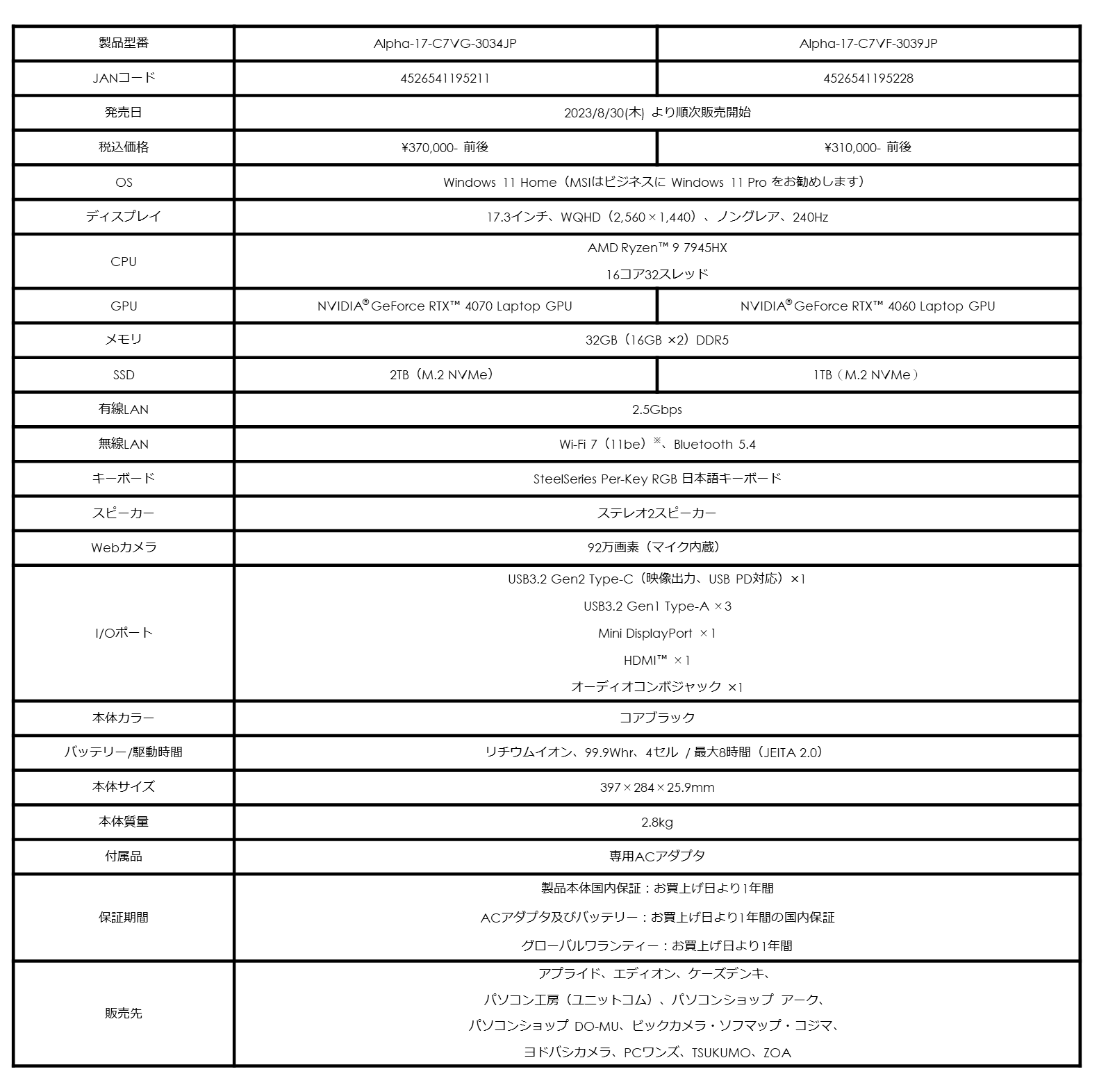 MSIノートPC史上初「Ryzen™ 9 7945HX」搭載ハイスペックゲーミングノート誕生! 「Alpha 17 C7V」シリーズ発売