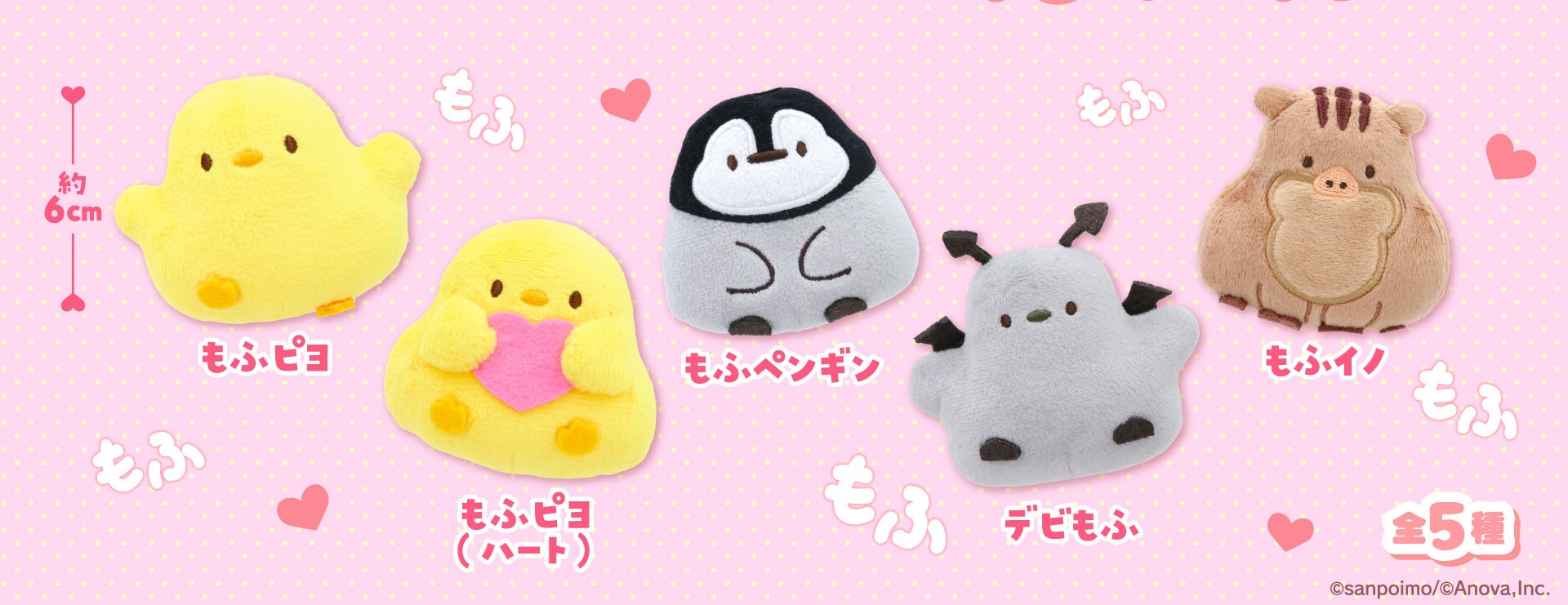 「もふピヨ」、「もふピヨ(ハート)」、「もふペンギン」、「デビもふ」とちょっとレアな「もふイノ」の全5種類。