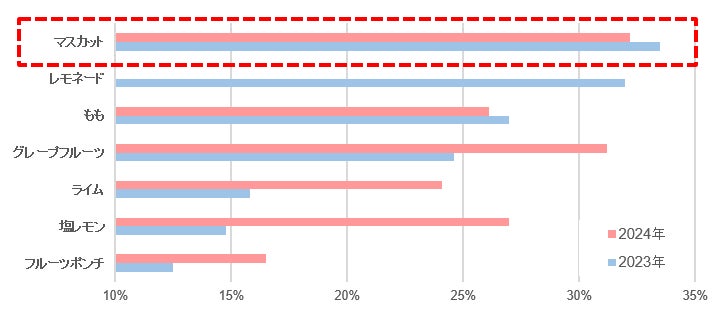 「清涼感」や「爽快感」においてご好評をいただいている天然水ゼリーですが、2023年、2024年とフレーバー調査を行った結果、2年連続でマスカットが第1位を獲得しました。今年はようやくマスカット風味を発売できるようになりましたので、多くのお客さまにご飲用いただければ幸いです。