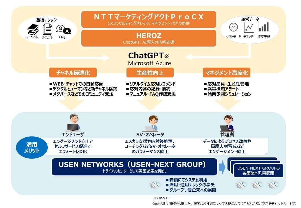NTTマーケティングアクトProCXとHEROZおよびUSEN-NEXT HOLDINGS ChatGPTを活用し、人と生成AIを融合した「次世代型コンタクトセンター」プロジェクト始動