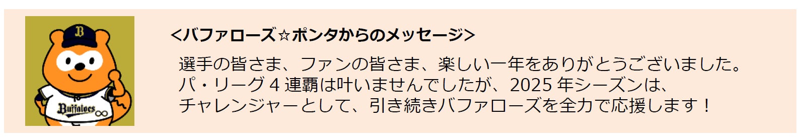 バファローズ☆ポンタは、2025年シーズンも引き続き、ファンの皆様とともに、オリックス・バファローズならびに野球界全体を全力で応援します。