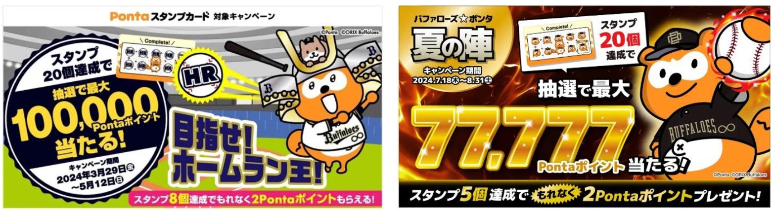 各回の期間中、参加条件を満たした方に抽選で以下をプレゼントします 1回目 10,000Pontaポイント(5名様) 100Pontaポイント(495名様) 2回目 【10年目記念】バファローズ☆ポンタ 必勝入魂帳(5名様) 【10年目記念】バファローズ☆ポンタ フェイスタオル(5名様) 3回目 10,000Pontaポイント(5名様) 100Pontaポイント(495名様) |