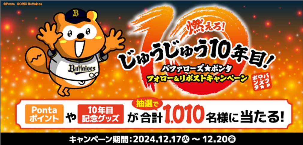 2025年シーズンのスポンサー契約が10年目となることを記念し、このたび、「バファローズ☆ポンタ 燃えろ! じゅうじゅう10年目! フォロー&リポストキャンペーン」の開催と新グッズの販売を開始します。