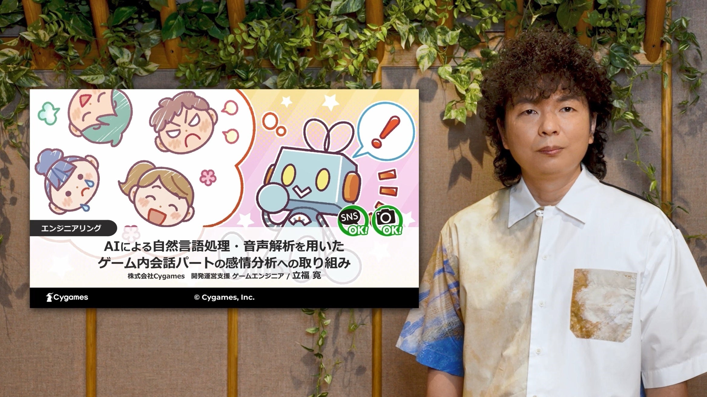 こちらの講演ではAIを活用してシナリオと音声からキャラクターの感情分析を行い、キャラクターの表情を自動的に求める仕組みについて説明します。