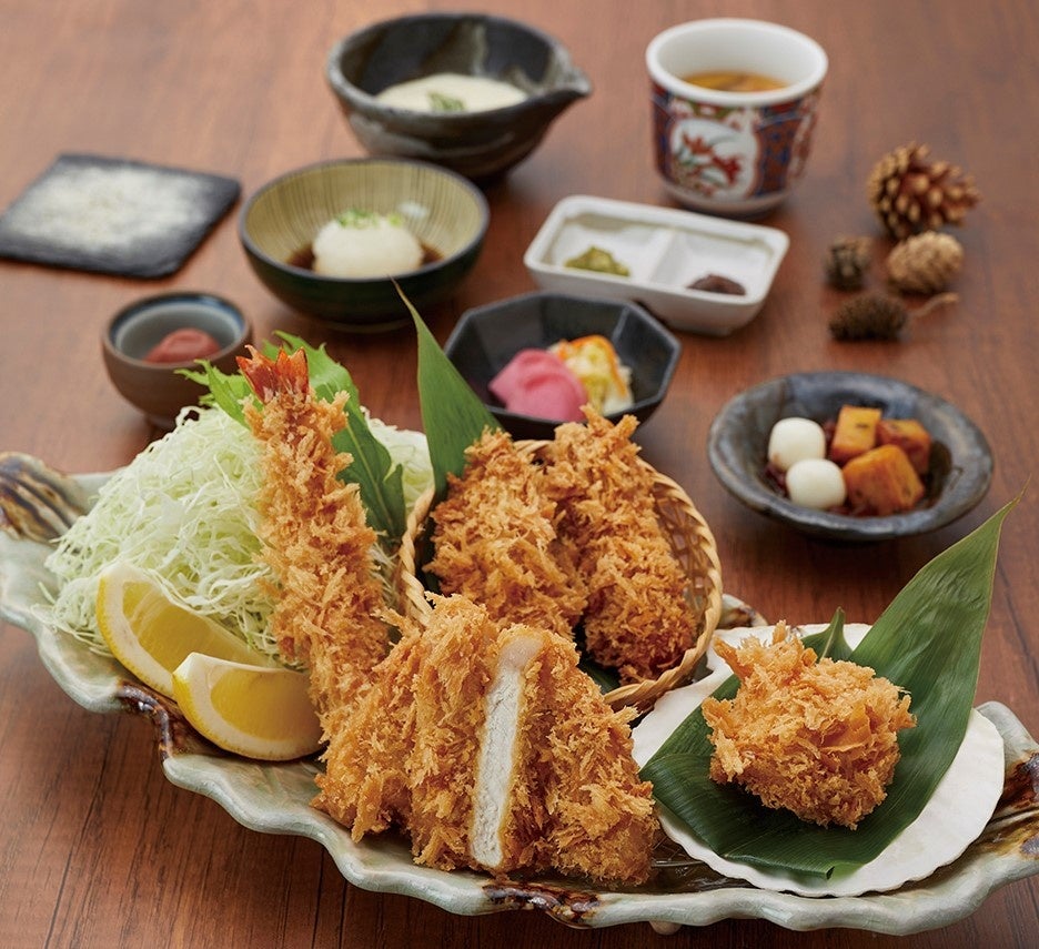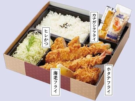 北海道産ホタテフライ・広島産牡蠣フライ(2個)・六穀豚ロースかつ(60g)・海老フライ・ご飯・味噌汁・漬物2種盛り・茶碗蒸し・季節の甘味(大学芋ぜんざい)・岩津ねぎ味噌・刻みわさび・知床羅臼こんぶ塩・南高梅・レモン
