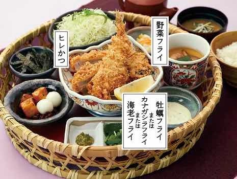金頭フライ(または広島産牡蠣フライか海老フライ)・ヒレかつ・野菜フライ・だし茶漬けセット・季節の甘味(大学芋ぜんざい)・ご飯・味噌汁・漬物・キャベツ・茶碗蒸し・ソフトドリンク