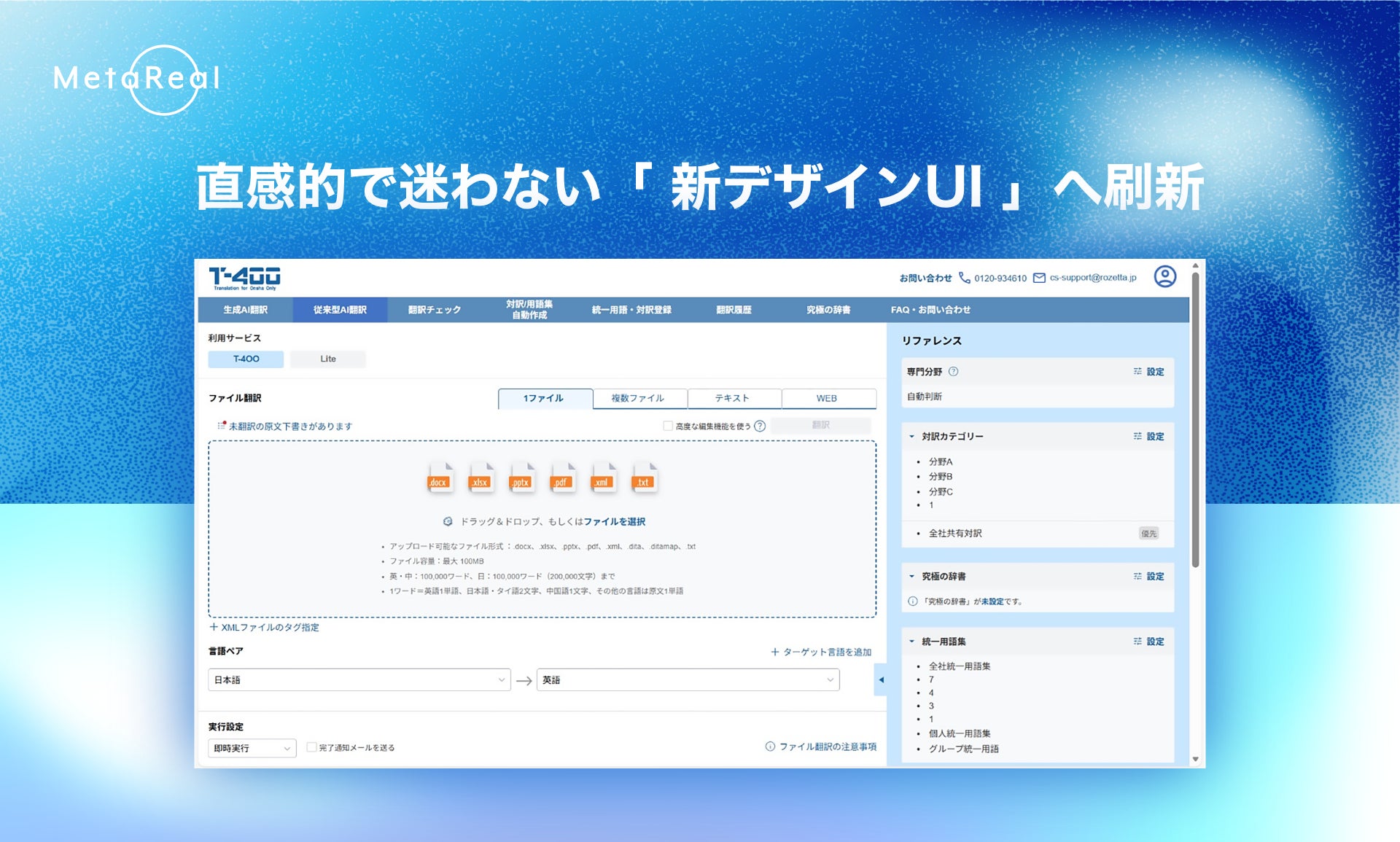 株式会社メタリアルグループで、国内市場No.1※のAI翻訳サービスを開発・提供する株式会社ロゼッタ(代表取締役:五石 順一)は、2026年1月、高精度AI翻訳「T-4OO(ティーフォーオーオー)」において、従来型AI翻訳機能の新デザインUIへのアップデートを実施したことをお知らせします。