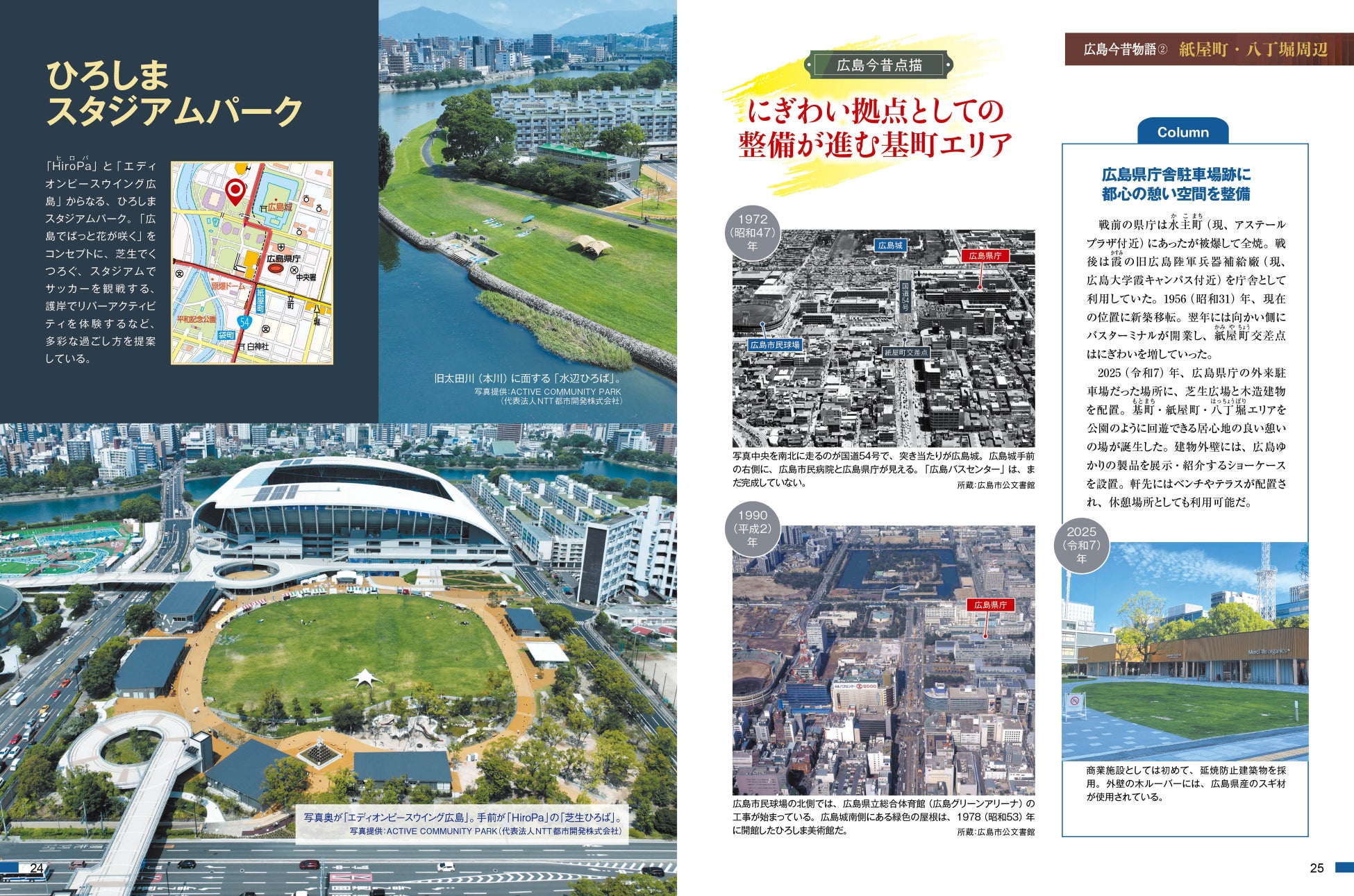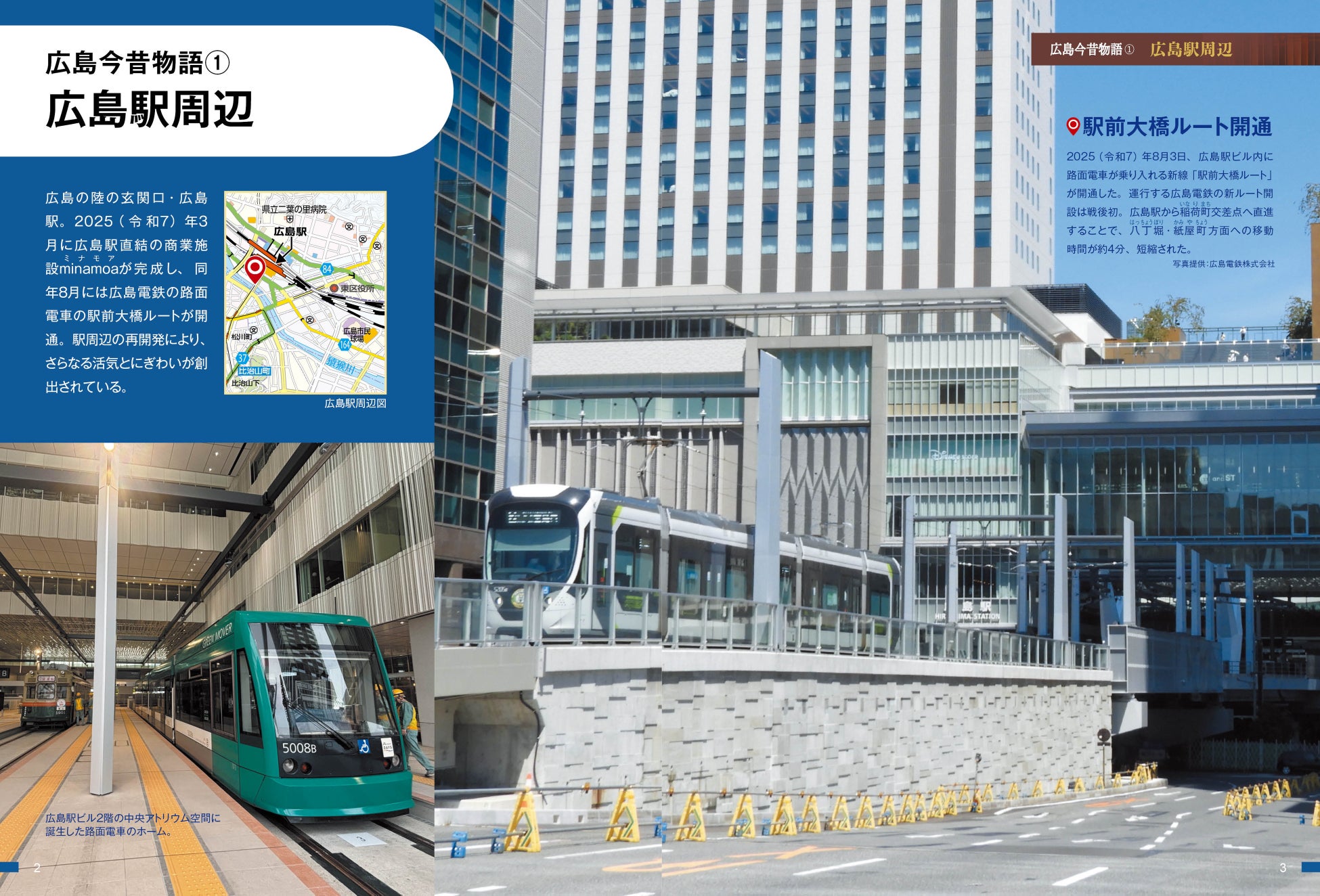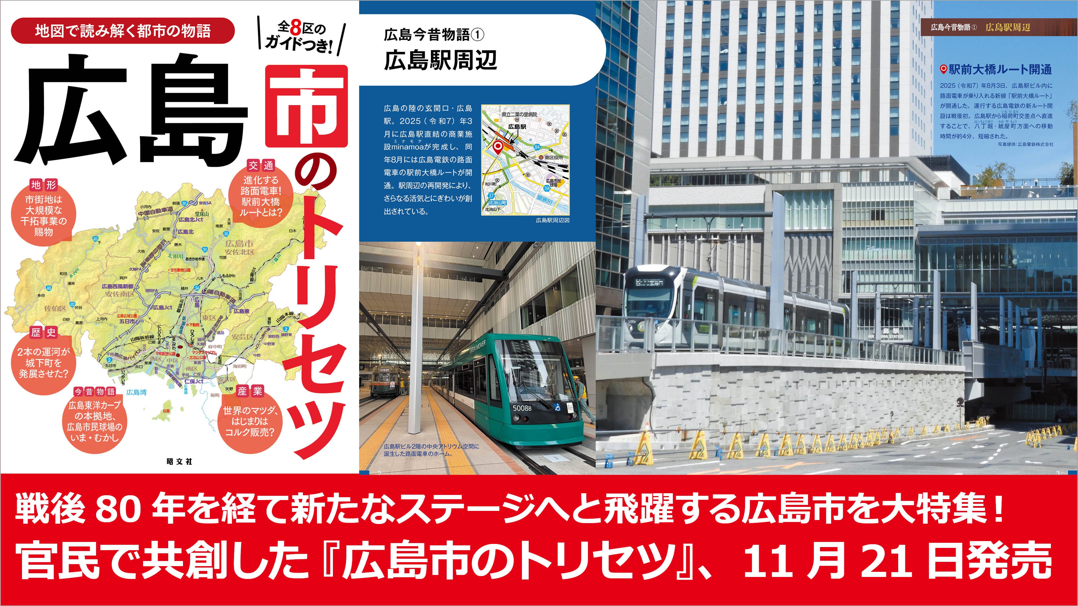 本書では、広島の陸の玄関口である広島駅周辺の大規模リニューアル、都心部に誕生した「まちなかスタジアム」、歴史と文化に触れるエリアとして再整備された広島城三の丸、そして基町・紙屋町・八丁堀エリアの再開発など、未来に向けて大きく変貌を遂げる広島の「いま」を、豊富な写真と地図で紹介する巻頭特集「広島今昔物語」で詳しく解説しています。