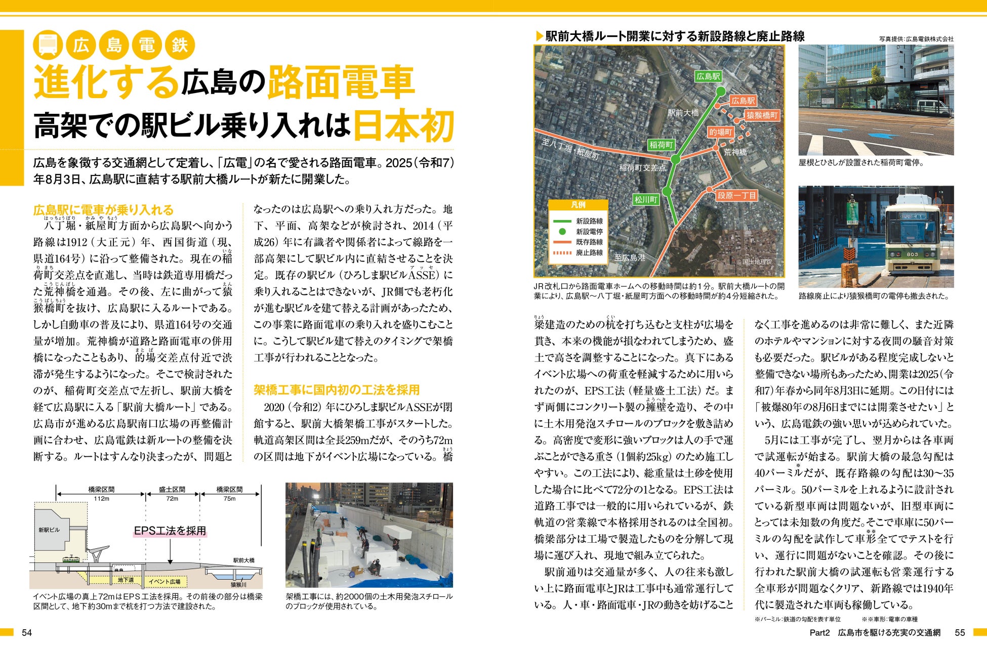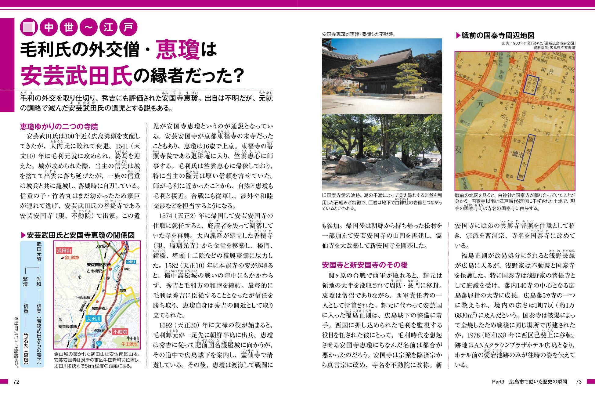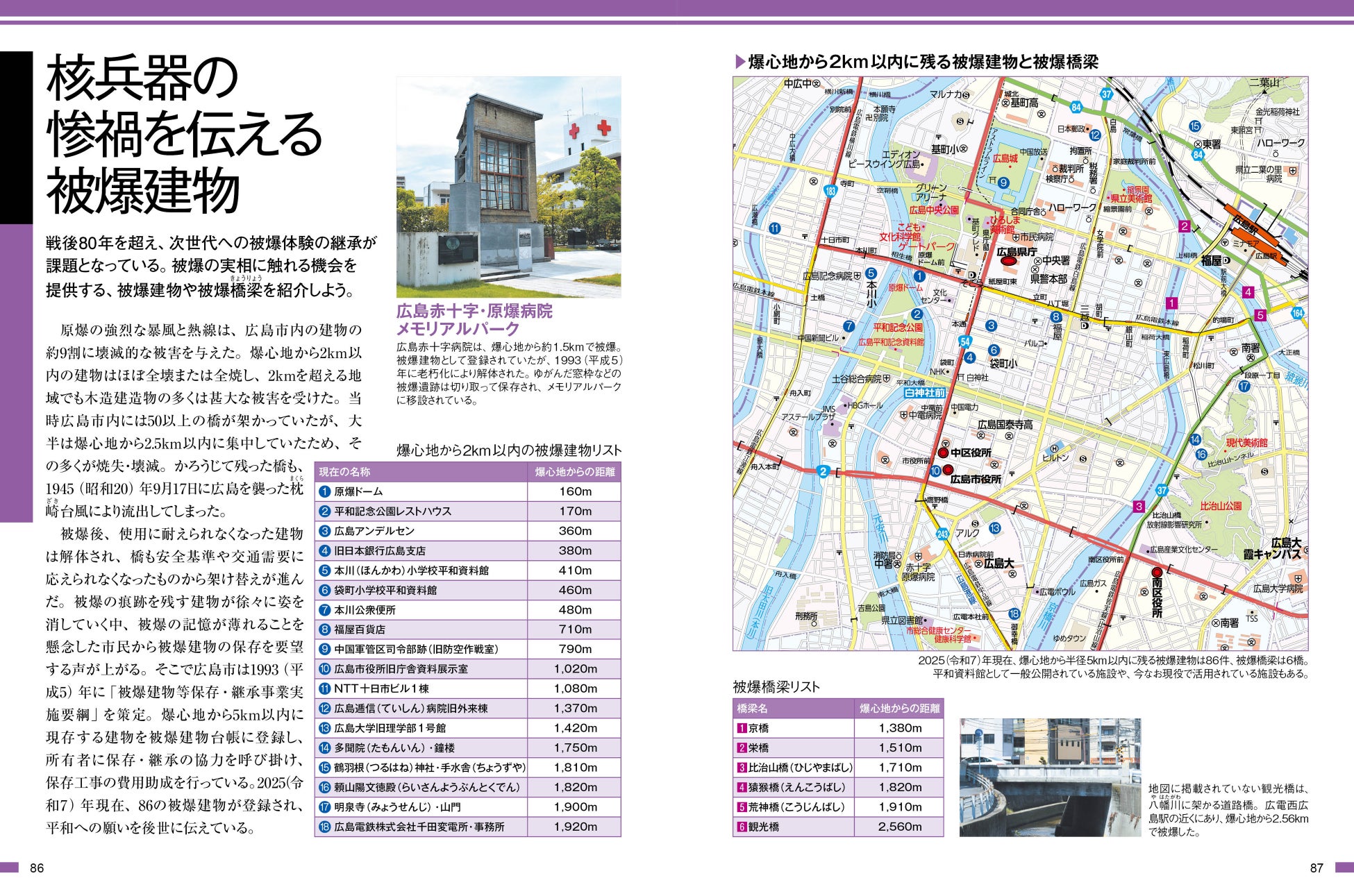 本書では、広島の陸の玄関口である広島駅周辺の大規模リニューアル、都心部に誕生した「まちなかスタジアム」、歴史と文化に触れるエリアとして再整備された広島城三の丸、そして基町・紙屋町・八丁堀エリアの再開発など、未来に向けて大きく変貌を遂げる広島の「いま」を、豊富な写真と地図で紹介する巻頭特集「広島今昔物語」で詳しく解説しています。