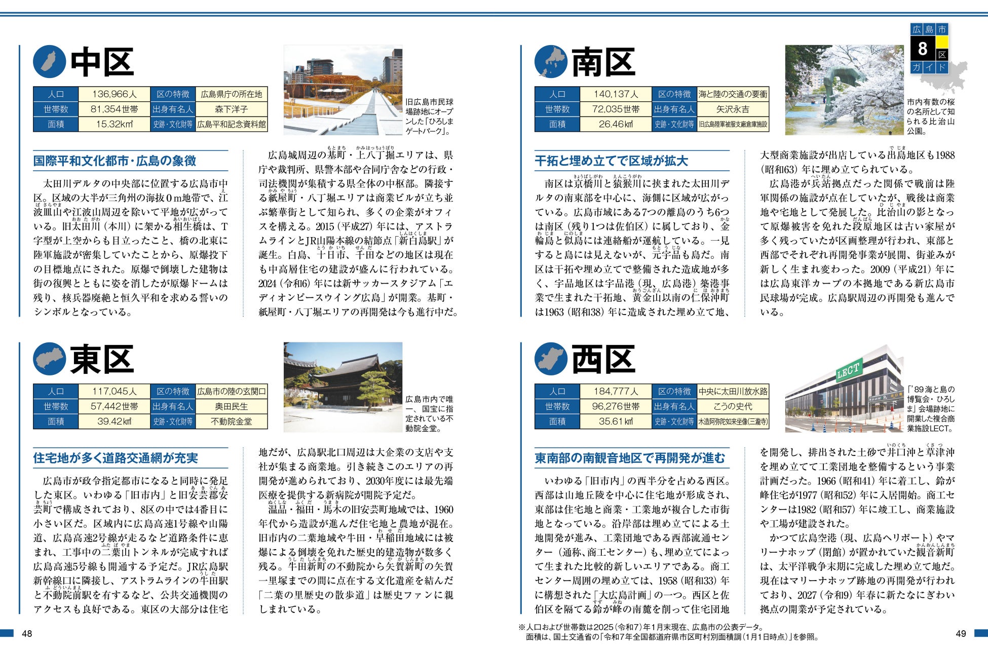 今回の都市編の特長として「各区ガイド」を掲載しています。人口、世帯数、面積、著名な出身者、区の花、木や名所などの基本情報に加え、区の沿革等も詳しくご紹介。