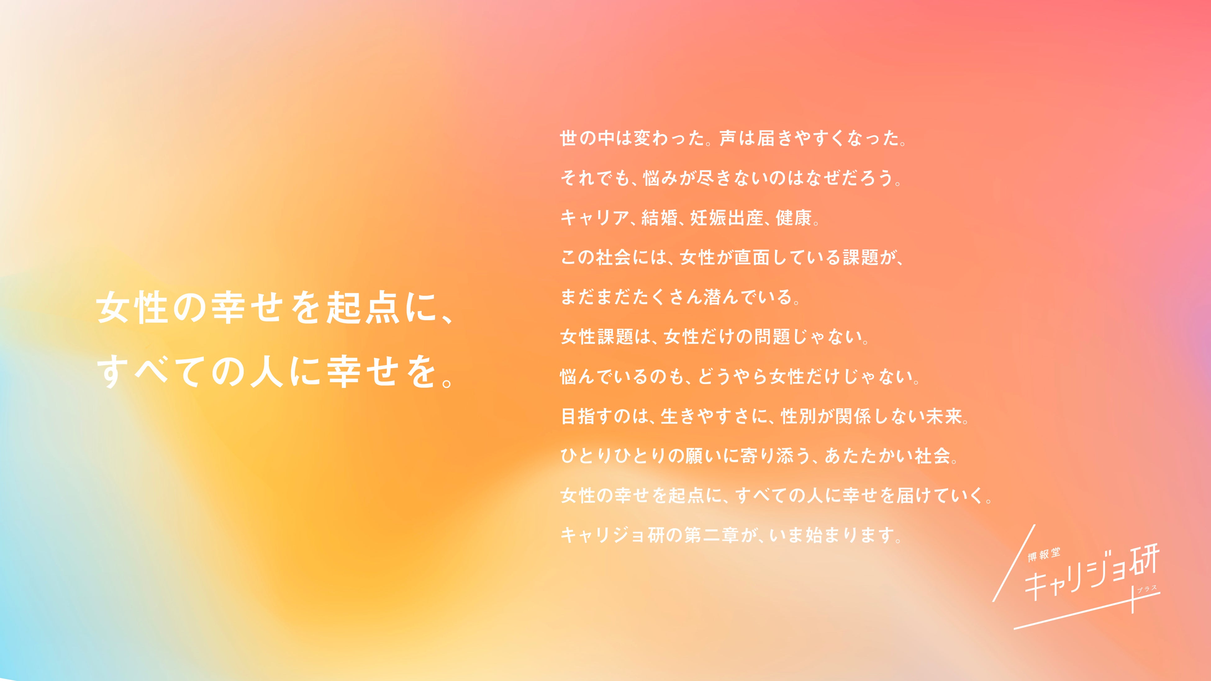 多様な立場にある生活者の声に向き合い、 企業や共創パートナーと共に、ひとりひとりが性別に関わらず、自分の選択肢や自己実現を叶えられる未来、ひいては”キャリジョという言葉を使わなくなる未来”の実現を目指していきます。
