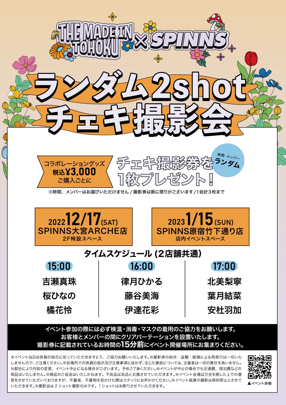 ・イベント参加条件:イベント当日、イベント開催店舗にていぎなり東北産×SPINNSコラボレーション商品税込3,000円毎お買い上げで1枚ランダム2ショットチェキ撮影券を配布いたします。