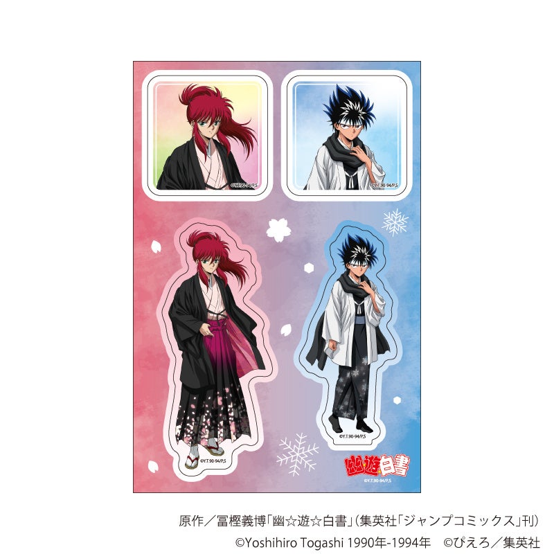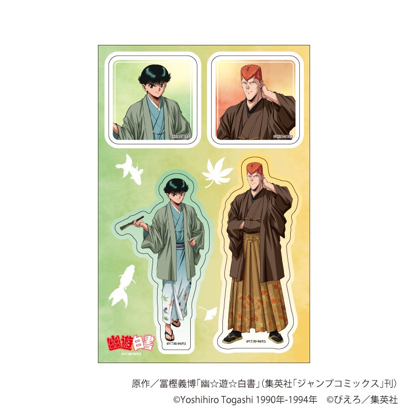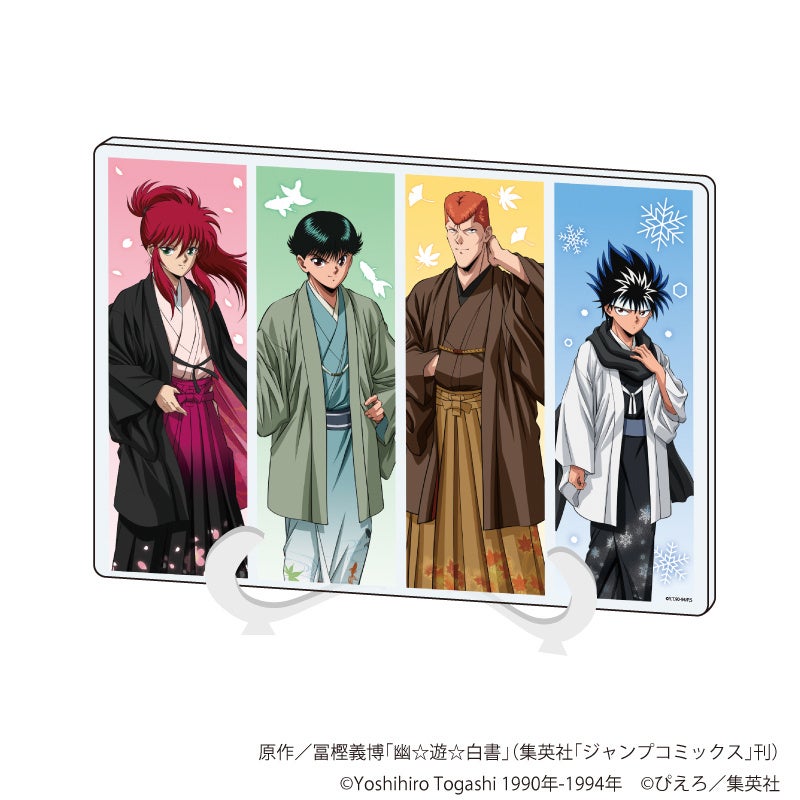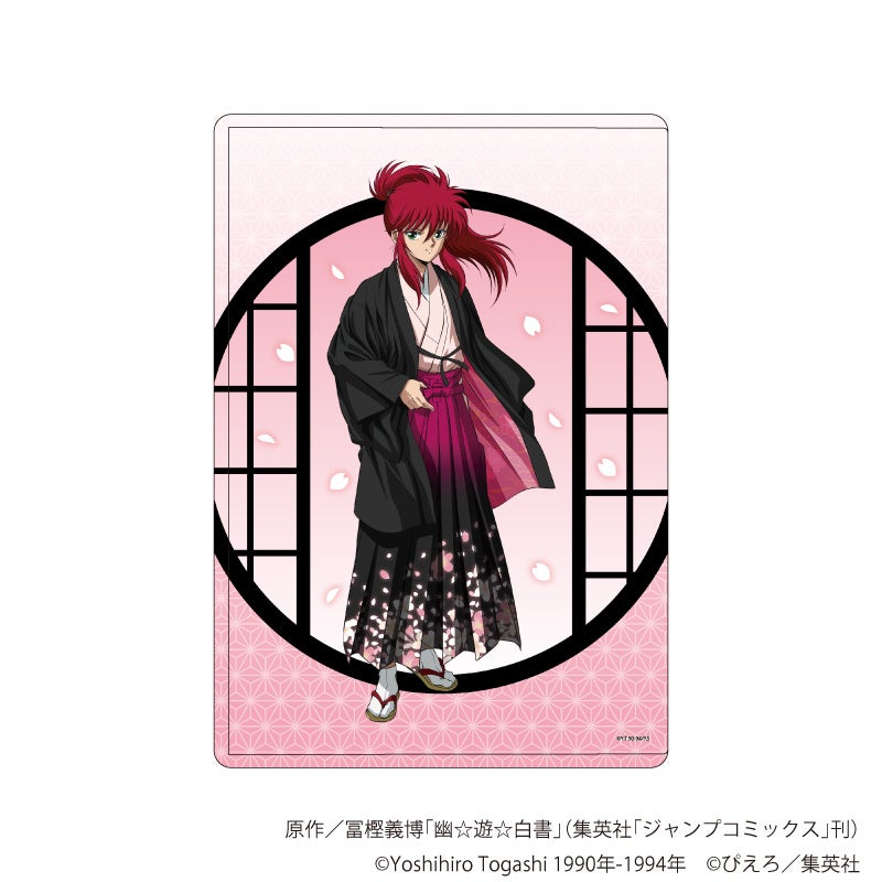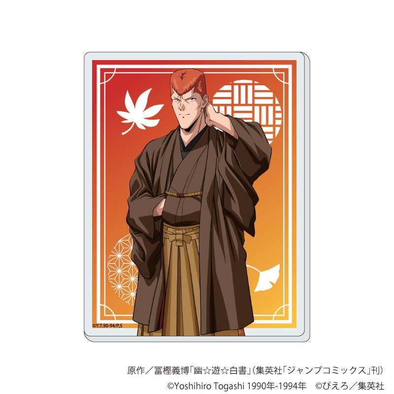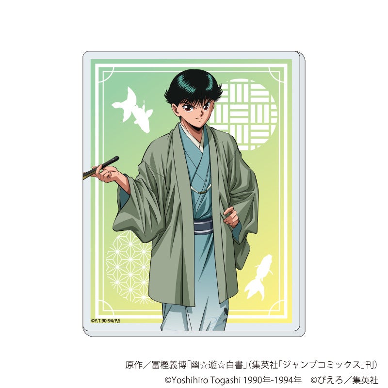 背景に季節のモチーフと和柄を取り入れたアクリルカード。着物を羽織った幽助たちの上品な雰囲気に、心惹かれること間違いなし!