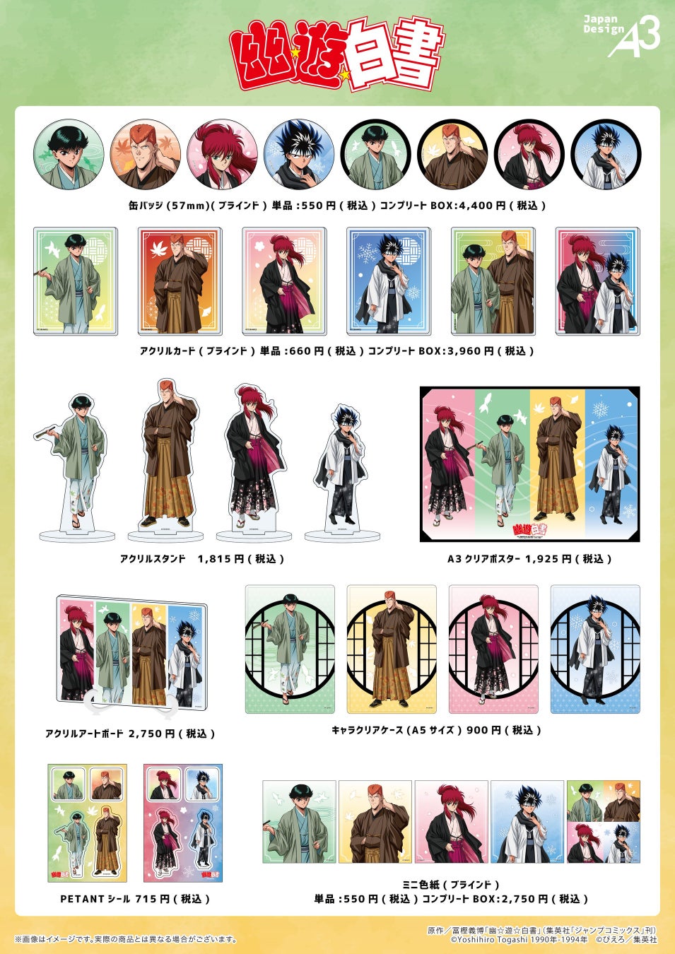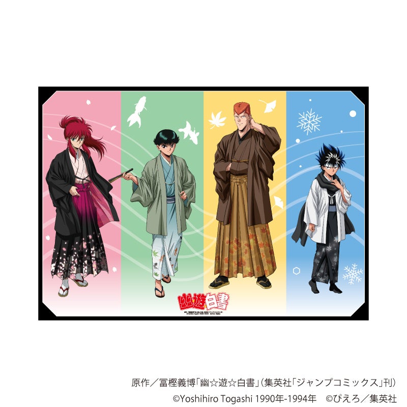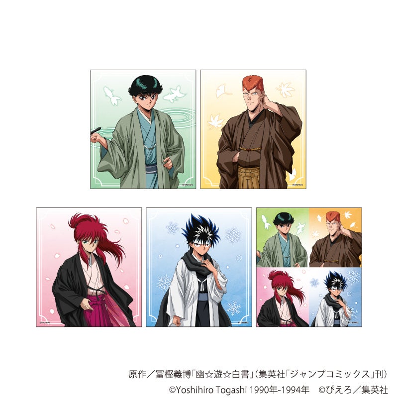 今回の描き下ろしイラストは「春夏秋冬」がテーマ。それぞれの季節を感じさせる和装で、いつもとは違う一面を見せる幽助、桑原、蔵馬、飛影に心を奪われてしまう……そんな“ひととせ”を彩る新作グッズが盛りだくさん!