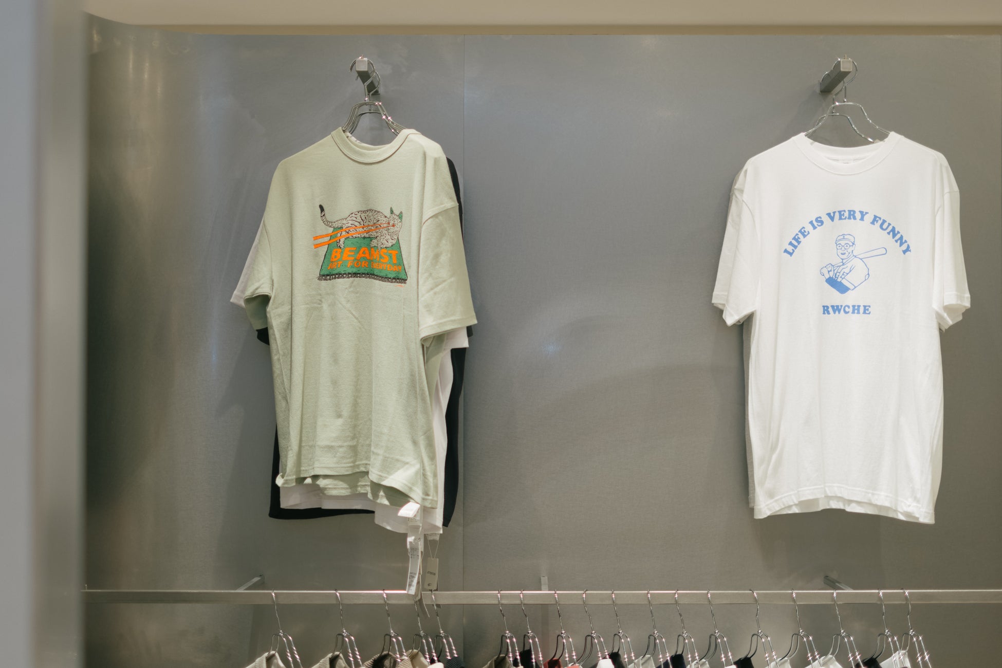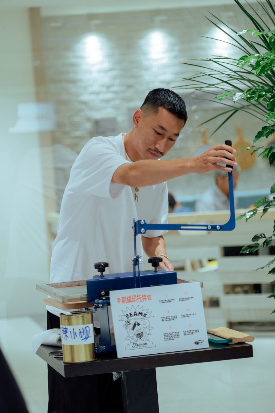 また、本出店に際し〈BEAMS T〉では、台湾および台南に拠点をおくクリエーター4名のグラフィックを採用した店舗限定Tシャツを4型用意したほか、オープン初日には、前述クリエイターの一人であるSalmo氏がデザインしたシルクスクリーンのライブプリントを行う店内イベント実施し、同店が出店する商業施設「新光三越台南新天地」を訪れるファッション感度の高い顧客へのアピールを行いました。