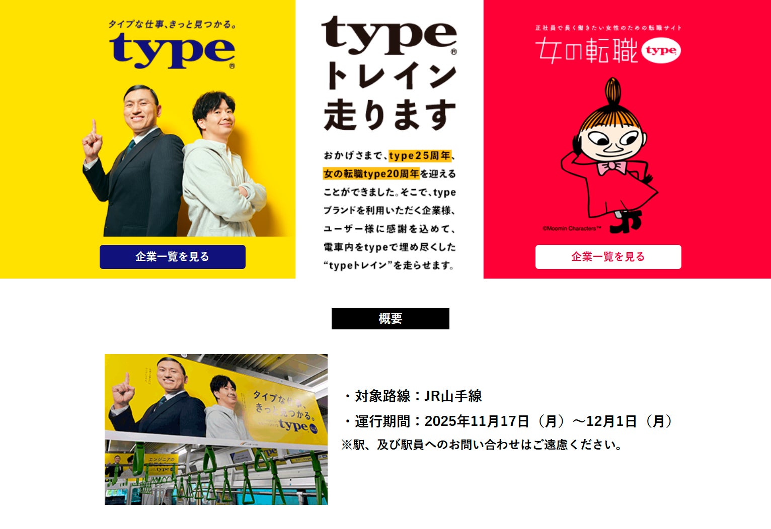 おかげさまで、type25周年、女の転職type20周年を迎えることができました。そこで、typeブランドを利用いただく企業、ユーザーの皆様に日々の感謝を込めて、電車内をtypeで埋め尽くした“typeトレイン”を走らせます。