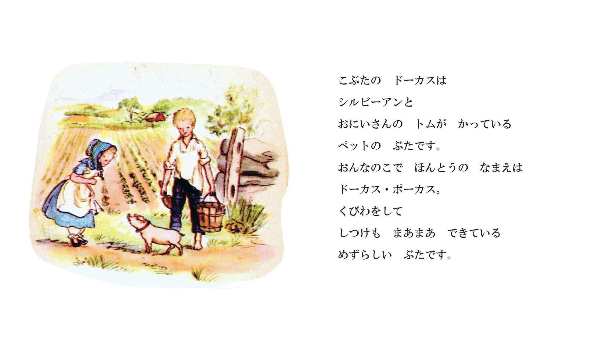 泥だらけになるのが大好きな、こぶたのドーカス。シルビーアンとお兄さんのトムが洗ってやろうとすると逃げ出して、お母さんが教会のご婦人達と開いていたパーティーのまっただ中へ……。