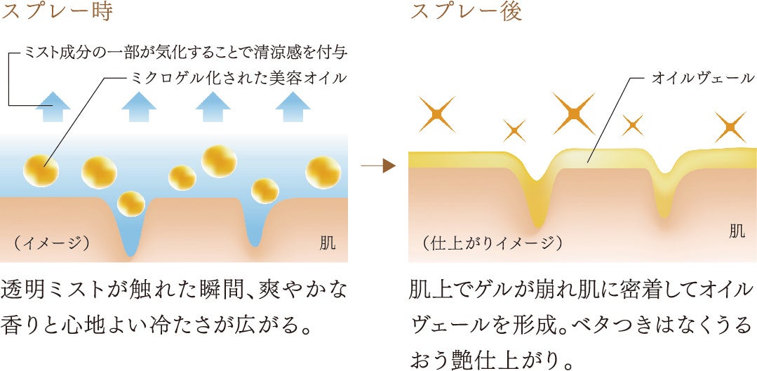 スプレーした瞬間に−3℃の清涼感に包まれます。厳選した美容オイル(保湿)をブレンドして細かいゲル粒子へとミクロゲル化することにより、肌に寄り添うように密着。さらに肌に密着した瞬間にゲルがオイルヴェールへと変化。心地よいうるおい感と艶感を感じながら、肌を紫外線から守ります。
