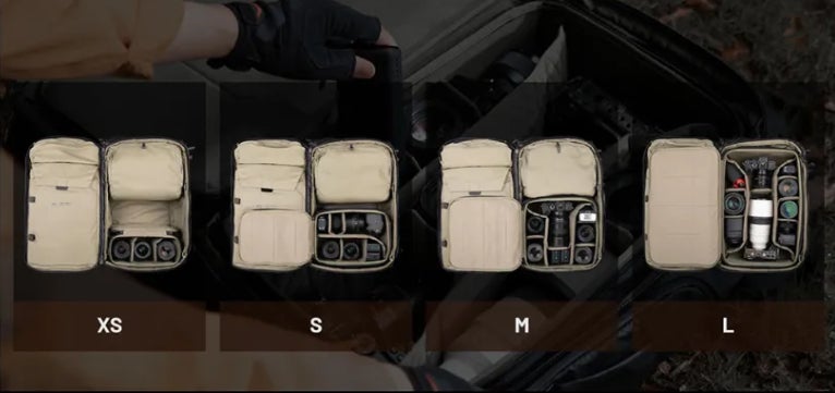 4サイズのカスタマイズ可能なカメラインサートバッグにより、用途に応じたセットアップが可能です。カメラインサートバッグにはショルダーストラップが付属(Lサイズを除く)し、カメラショルダーバックとして持ち運びできます。