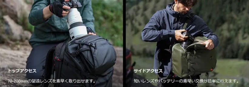 トップとサイドのアクセスで機材を直ぐに取り出して撮影することができます。トップからは70-200mmの望遠レンズを素早く取り出せ、サイドは短いレンズやバッテリーの交換が簡単に行えます。