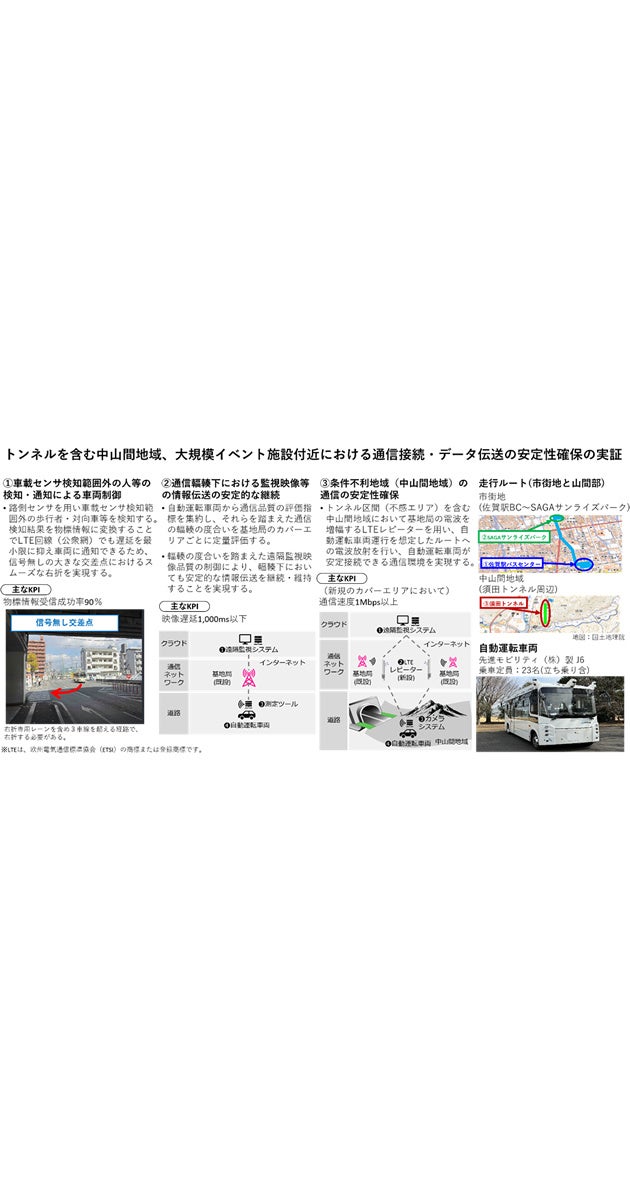 深刻なバス運転手不足の対策の一つとして、自動運転バスのレベル4導入への期待が高まっています。2023年4月の道路交通法改正により、日本でも特定地域での自動運転レベル4が解禁されました。今回の実証では、佐賀市にて、混雑する市街地における歩行者・車両への注意が必要な3車線の無信号交差点で車両制御(右折)する、自動運転の中でも難易度が高い実証走行を行います。また、市街地の集客施設付近の通信が混みあっている輻輳(ふくそう)時や、トンネル区間や中山間地域等の電波が届きにくく通信が困難な不感地帯等での安定的な通信品質の検証を行います。