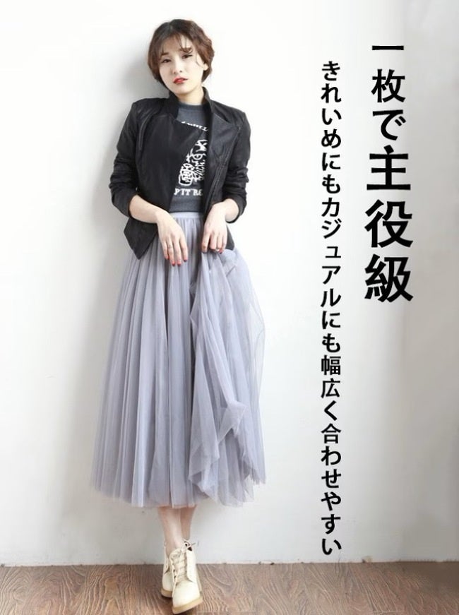 裏地と3層のチュールが織りなす華やかなシルエットで主役級の一枚。ストレスフリーなウエストゴムに、丈は10㎝刻みの3タイプ。