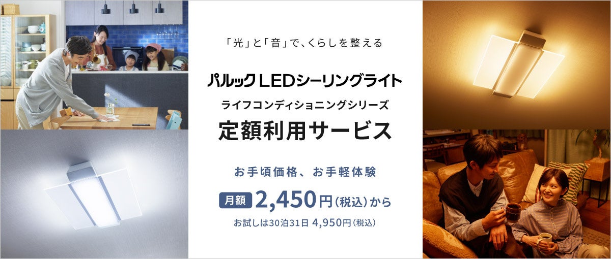 この度、「スマートフォンやスマートスピーカーで照明を操作してみたい」「天井から降り注ぐ迫力のサウンドを体験してみたい」といったお客様のご要望にお応えするため、パルック LEDシーリングライト「ライフコンディショニングシリーズ」を定額利用サービスに追加します。まずは本サービスで気軽に試してみませんか。