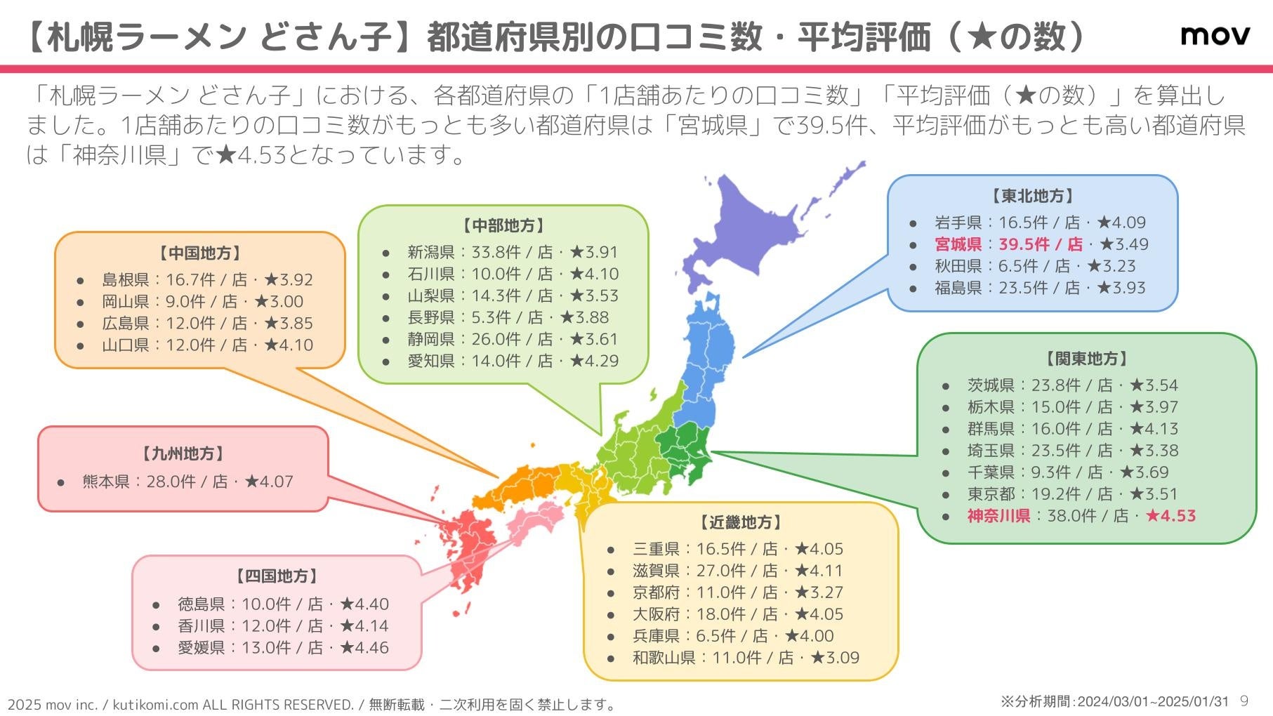 こちらのスライドでは、「札幌ラーメン どさん子」における各都道府県の「1店舗あたりの口コミ数」「平均評価(★の数)」を算出しています。1店舗あたりの口コミ数がもっとも多い都道府県は「宮城県」で39.5件、平均評価がもっとも高い都道府県は「神奈川県」で★4.53となっています。