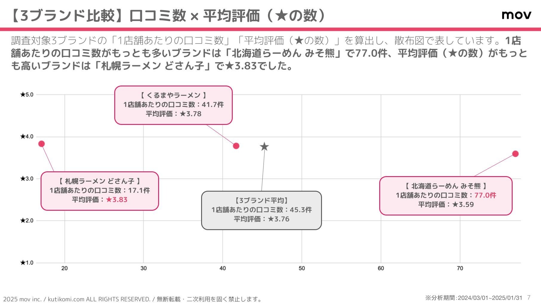 こちらの散布図では、調査対象3ブランドの「1店舗あたりの口コミ数」「平均評価(★の数)」を算出しています。1店舗あたりの口コミ数がもっとも多いブランドは「北海道らーめん みそ熊」で77.0件、平均評価(★の数)がもっとも高いブランドは「札幌ラーメン どさん子」で★3.83でした。