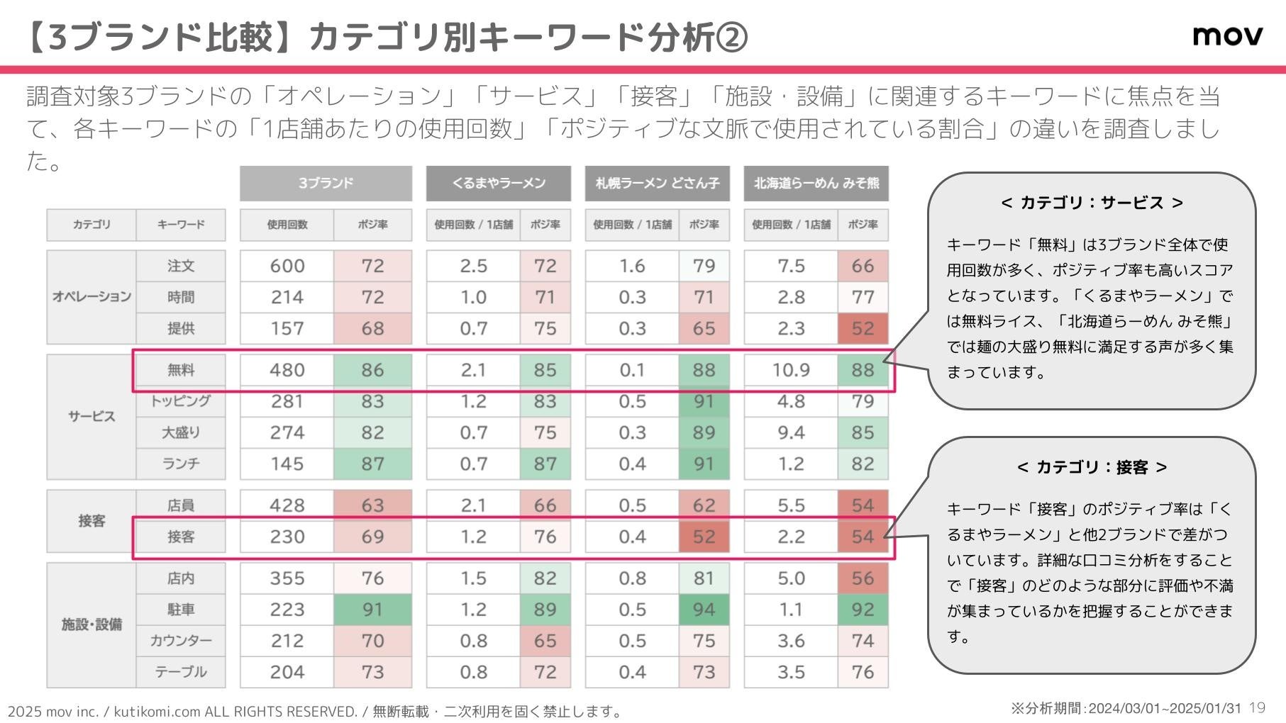 こちらの表では、調査対象3ブランドの「オペレーション」「サービス」「接客」「施設・設備」に関連するキーワードに焦点を当て、各キーワードの「1店舗あたりの使用回数」「ポジティブな文脈で使用されている割合」の違いを調査しています。