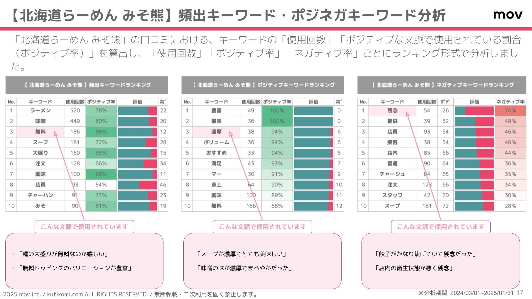 こちらの表では「北海道らーめん みそ熊」の口コミにおける、キーワードの「使用回数」「ポジティブな文脈で使用されている割合(ポジティブ率)」を算出し、「使用回数」「ポジティブ率」「ネガティブ率」ごとにランキング形式で分析しています。