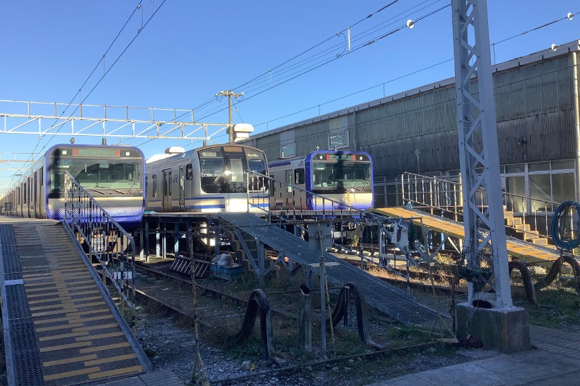 JR大船駅から鎌倉車両センターまでの移動は、E259系「成田エクスプレス」の回送列車に乗車いただき、お客さまが普段乗車することのできない専用線路を通り、往路では「車両洗浄装置」通過も体験していただきます。鎌倉車両センター到着後は、見学の内容や注意事項の説明を車内放送にて実施します。