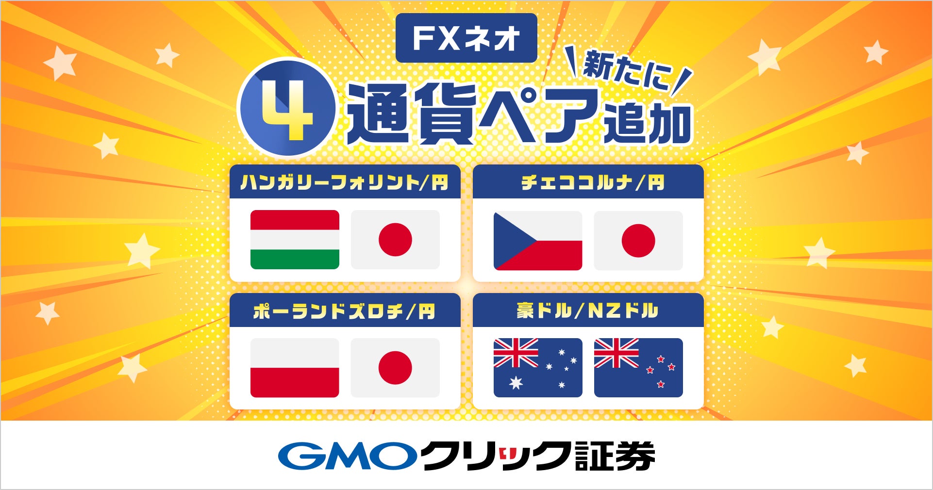GMOインターネットグループのGMOフィナンシャルホールディングス株式会社の連結会社で、金融商品取引業を営むGMOクリック証券株式会社(本社:東京都渋谷区、代表取締役社長:高島 秀行、以下:当社)は、2025年3月17日(月)より、店頭FX取引サービス「FXネオ」において、チェココルナ/円、ポーランドズロチ/円、ハンガリーフォリント/円、豪ドル/NZドルの4通貨ペアの取り扱いを開始いたします。
