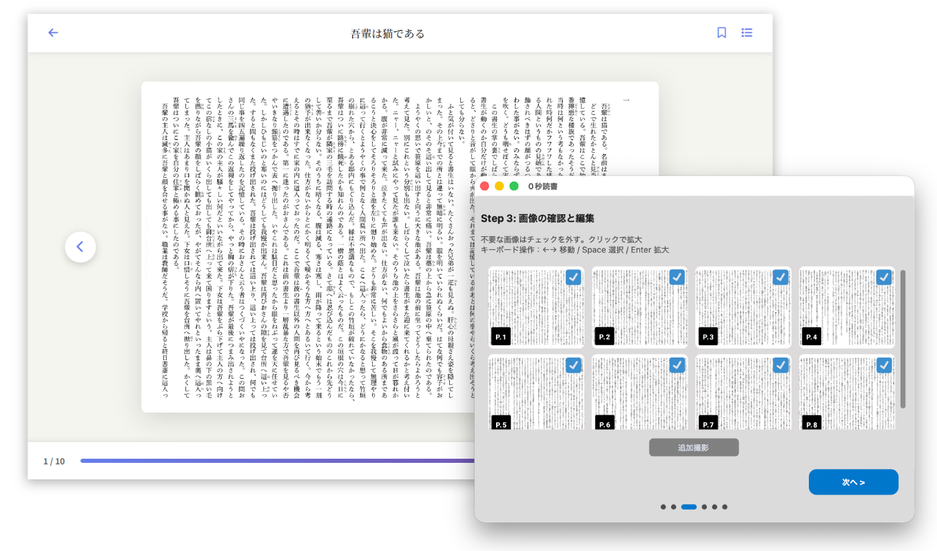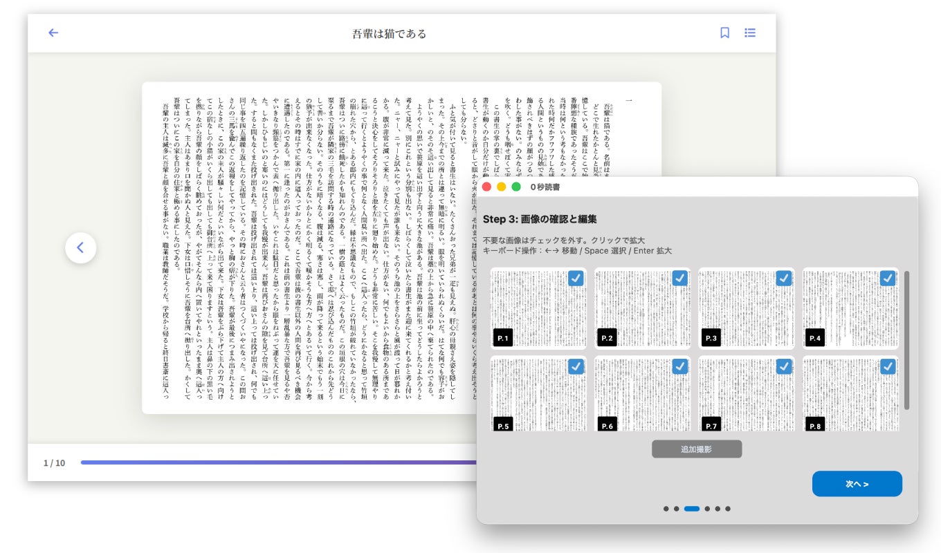 ページ送りの方向を指定し、キャプチャしたい画面を選択するだけ。あとは何も操作せず、放置しておけばOKです。「0秒読書」が自動でページを送り、キャプチャし、PDFを生成。100ページの書籍なら約3分でキャプチャが完了します。完成したPDFは透明テキストを付けられるので、AIが内容を正確に理解し、そのまま活用できます。