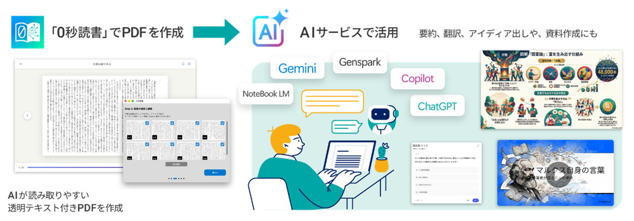 「0秒読書」は、手持ちの電子書籍や資料を、AIで“使える知識”として活用するためのツールです。本製品で作成したPDFは、単なるスキャンデータではありません。本の内容を、AIが理解し、活用できる形でまとめたデータです。これをGemini、NotebookLM、ChatGPT、Copilot、GensparkなどのAIサービスに読み込ませることで、本は「読むもの」から「使うもの」へと変わります。