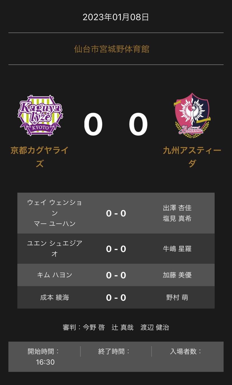 ノジマTリーグ 2022-2023シーズン 公式戦 1月8日開催 京都カグヤライズ vs 九州アスティーダ オーダー発表