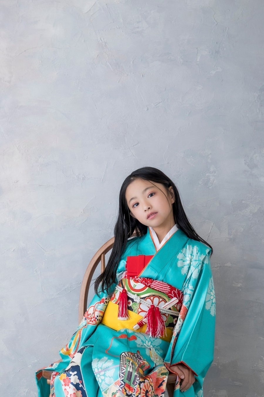 古典的なブルーのお着物を、色鮮やかにコーディネート。ヘアスタイル、シンプルな背景で引き算して、”今っぽい”バランスに!伝統とおしゃれを同時に楽しみましょう。