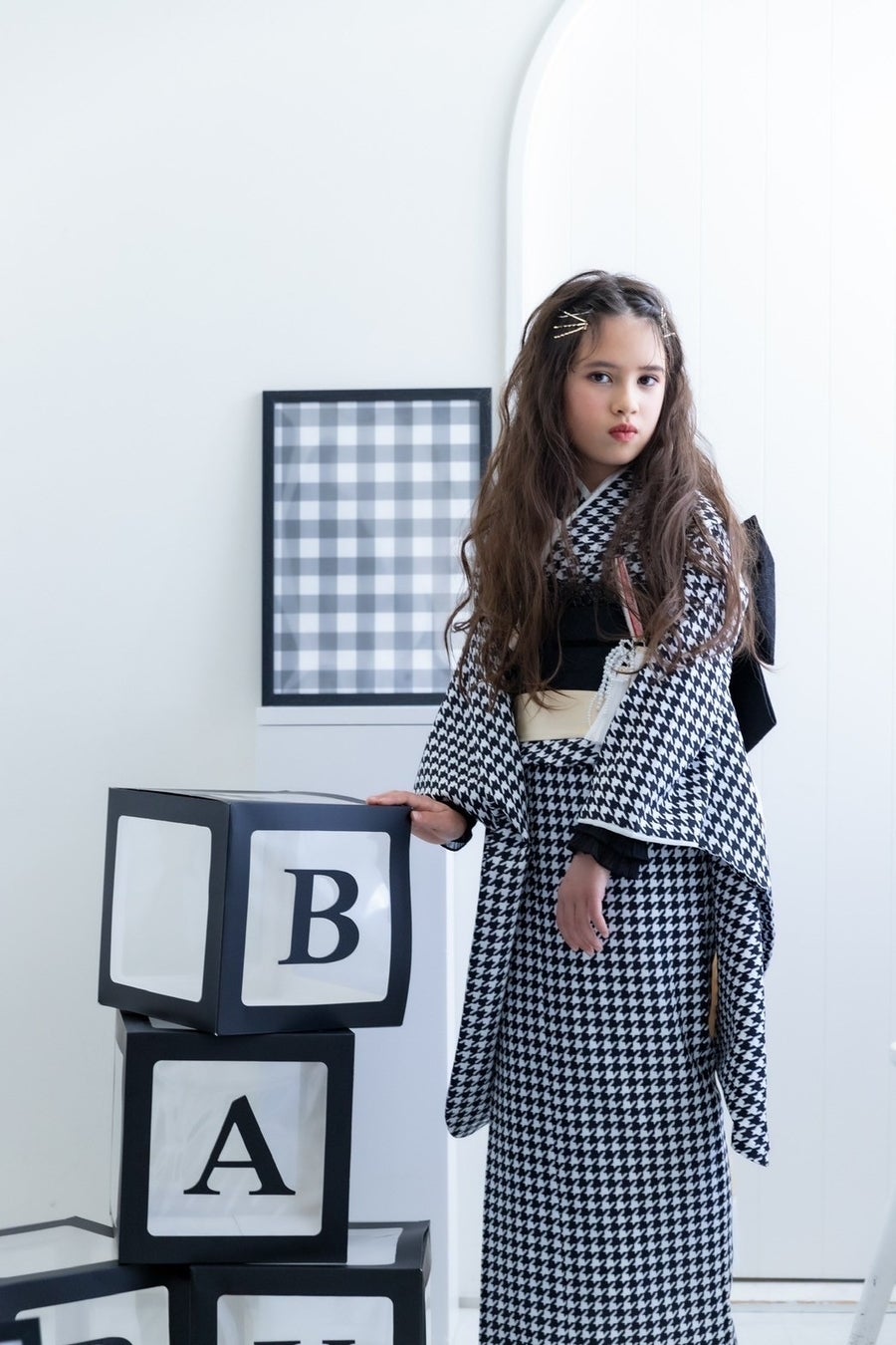 オシャレなブラック&ホワイトのワントーンな空間。千鳥格子の着物をあわせてファッショナブルに。可愛いのに、かっこいい、そんなイメージです。