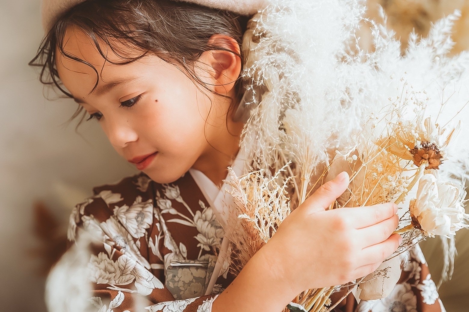 ブラウンの総柄のお着物に帽子やフリルアイテムなどを合わせて、可愛らしくコーディネートしました。ドライフラワーの背景は、誰が見てもオシャレ。