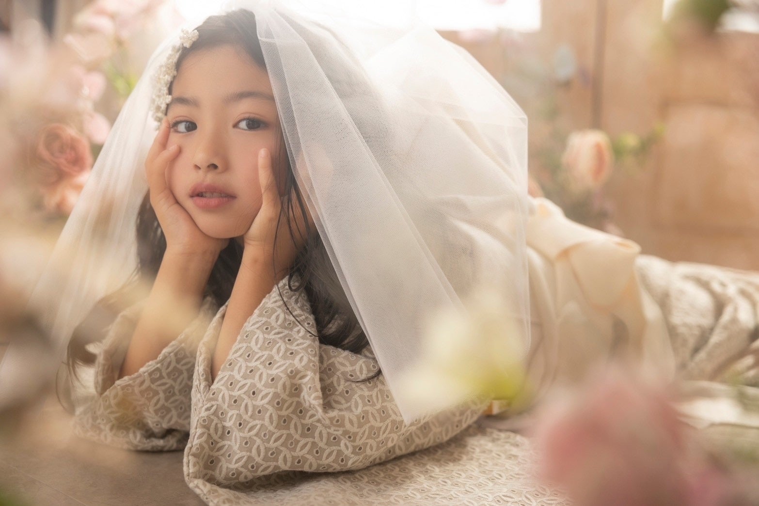 女の子の憧れ、お花いっぱいの空間で、ドーリーでスイートに。グレーレースのお着物は、”かわいい”が大好きな女の子にぴったりです。普段ブライダル撮影を行っているカメラマンが撮影しますので、大人っぽかわいいポージングアテンドもお任せください。