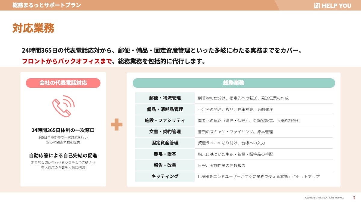 「総務まるっとサポートプラン」は、24時間365日の代表電話応対から、郵便・備品・固定資産管理といった現場作業までをカバー。フロント業務からバックオフィス業務まで、総務領域を包括的に代行するBPOサービスです。